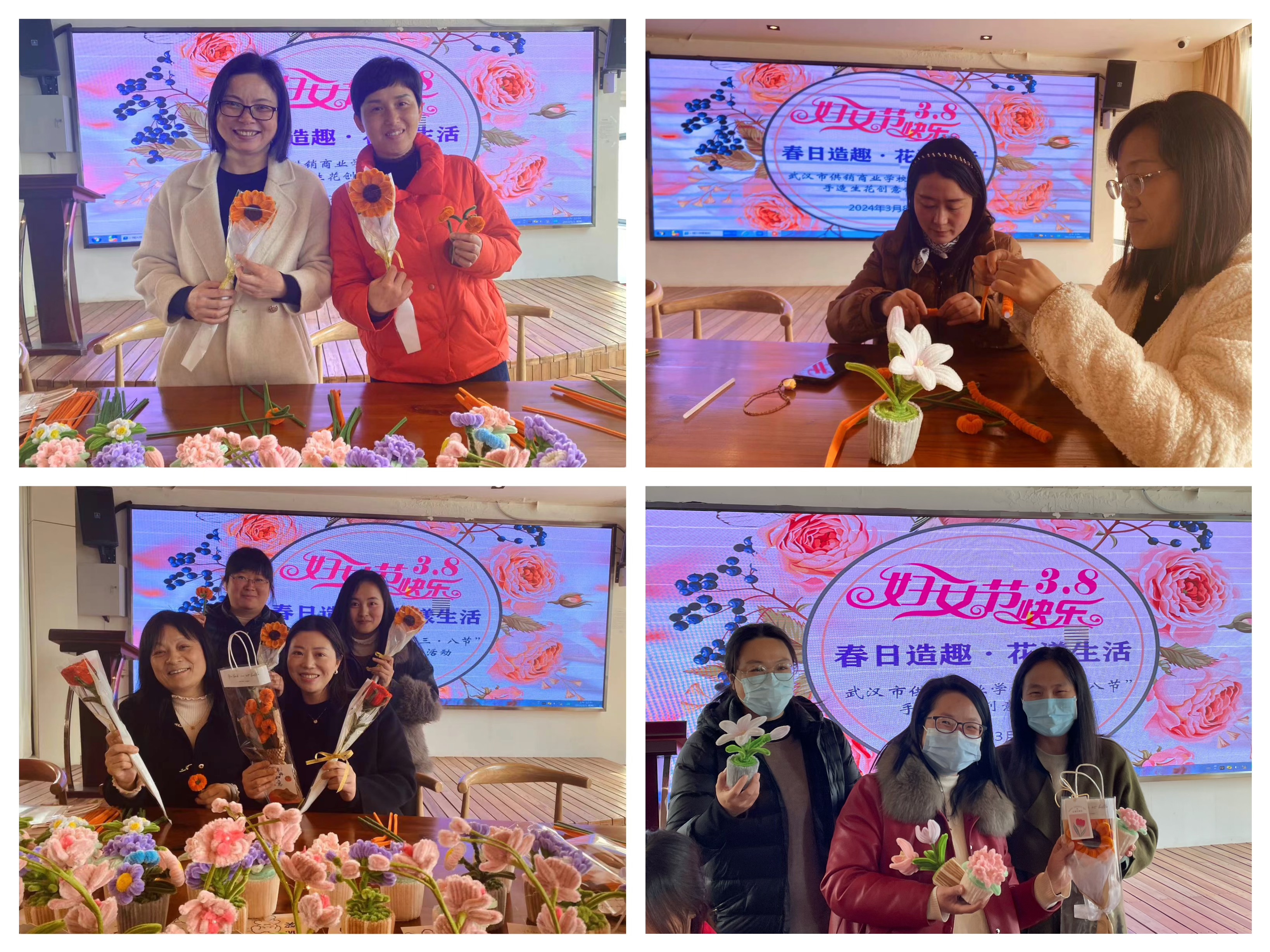 (通讯员 关越)冬季的寒意渐渐退去,春日的暖阳款款洒落,柳丝依依,芳华熠熠。在这个希望满满的美好春日里,我们迎来了第114个“三八”国际劳动妇女节。学校党政工团向辛勤耕耘在教育教学一线的全体女同胞及退休女教职工致以诚挚的节日问候;向所有关心支持学校妇女事业发展的领导和同志们致以深深敬意。为丰富女教职工节日文化生活,3月8日,武汉市供销商业学校工会组织开展了“春日造趣 花漾生活”手造生花创意制作活动。