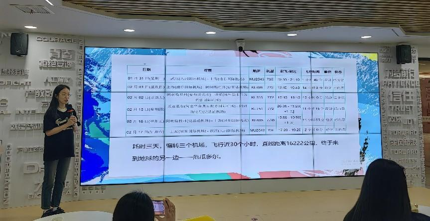 公共基础部何宁主任分享在南美洲国家厄瓜多尔的精彩见闻。何主任介绍说,厄瓜多尔地处地球的中心,是赤道上的神秘国度。“一根钉子立起一个鸡蛋”、“两脚跨过两个半球”、“高大的仙人掌树”等当地独特景观目不暇接,让大家体会了别样的异域风情,感受到大自然的神奇力量和人类文明的多样性。