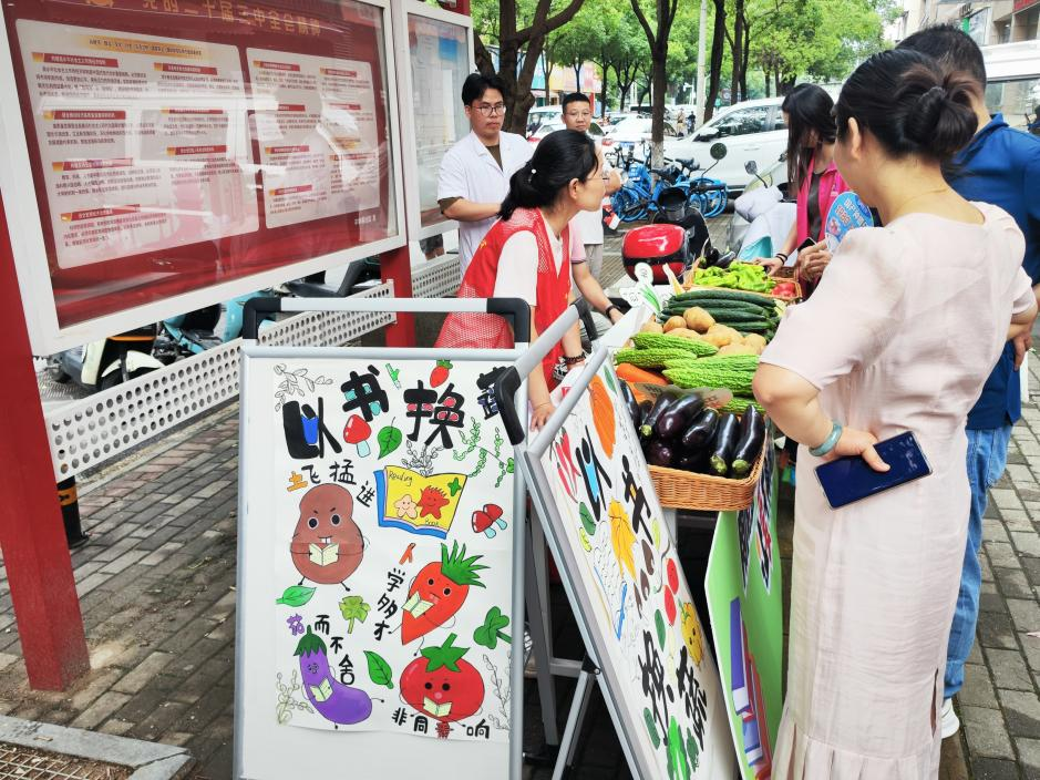 我校23级艺术设计与制作2班的学生还为社区开展的“以书换蔬”活动绘制了精美的海报,生动有趣的蔬菜形象引得路人驻足观赏,活动开展井然有序。