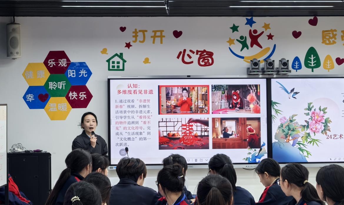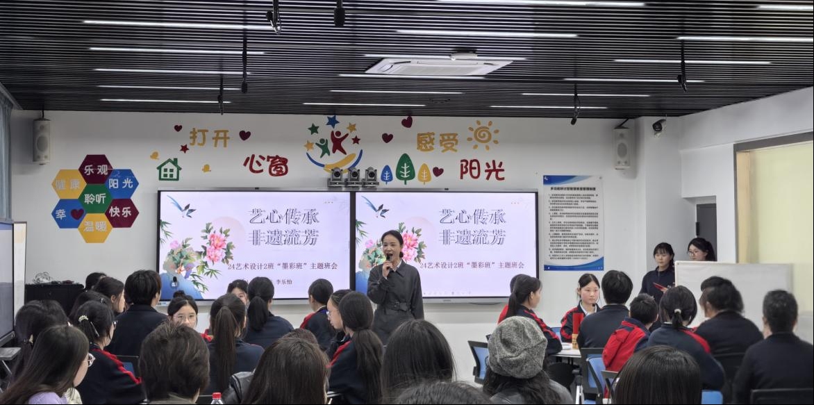 “文雨”名班主任工作室瞿敏老师以传承非遗文化为主题,融合美术设计制作专业与非遗技艺在美学表达、创意设计等元素,为大家带来一场视觉盛宴,促使学生深入理解“非遗”概念,认识非遗在生活中的渗透,掌握非遗中“中国审美”。同时采用“非遗+AI”形式,沉浸式体验,为非遗传承注入新活力,增强学生对中华优秀传统文化的认同感和自豪感,激发对非遗传承的热爱与行动热情,树立文化自信。