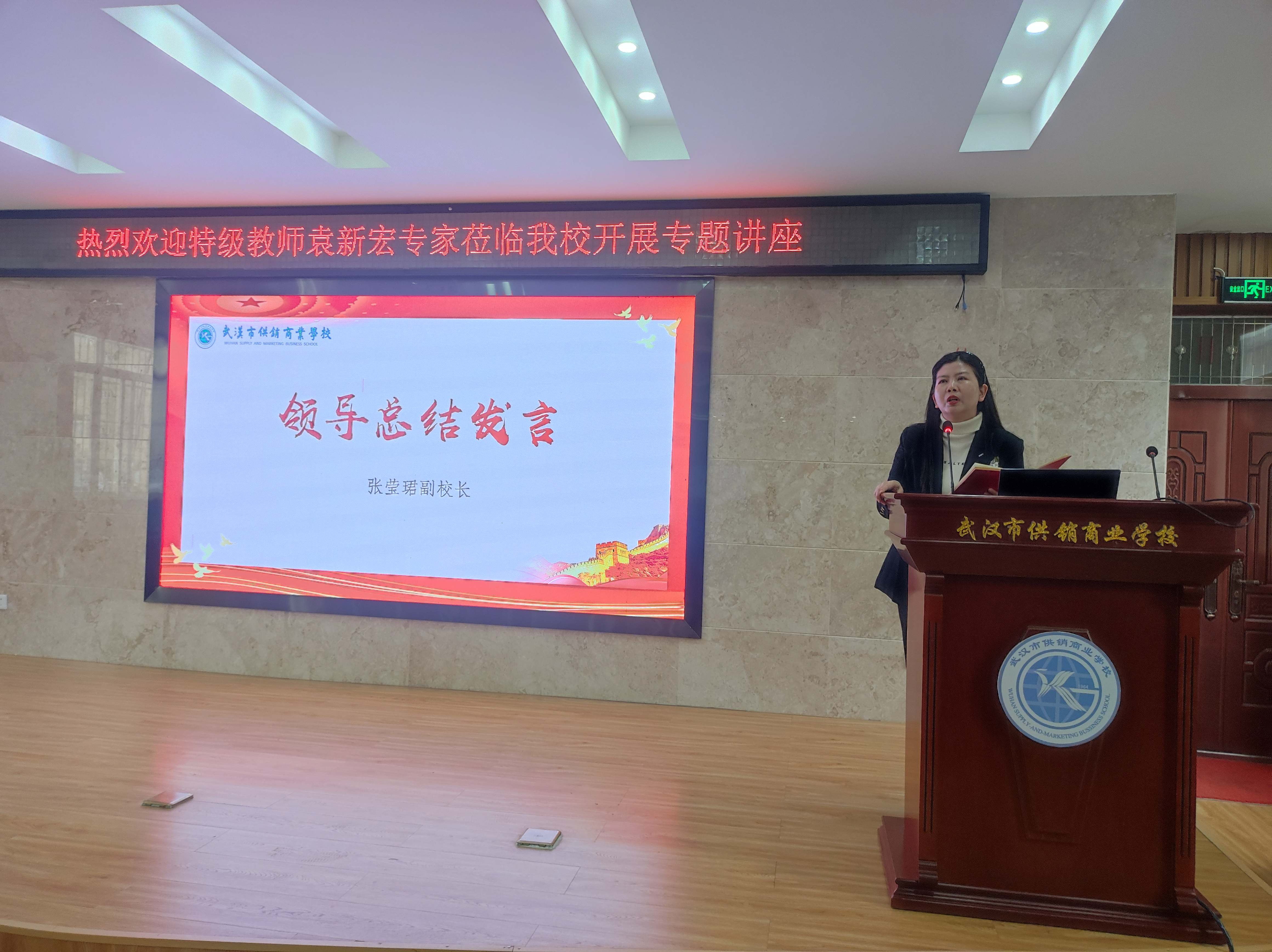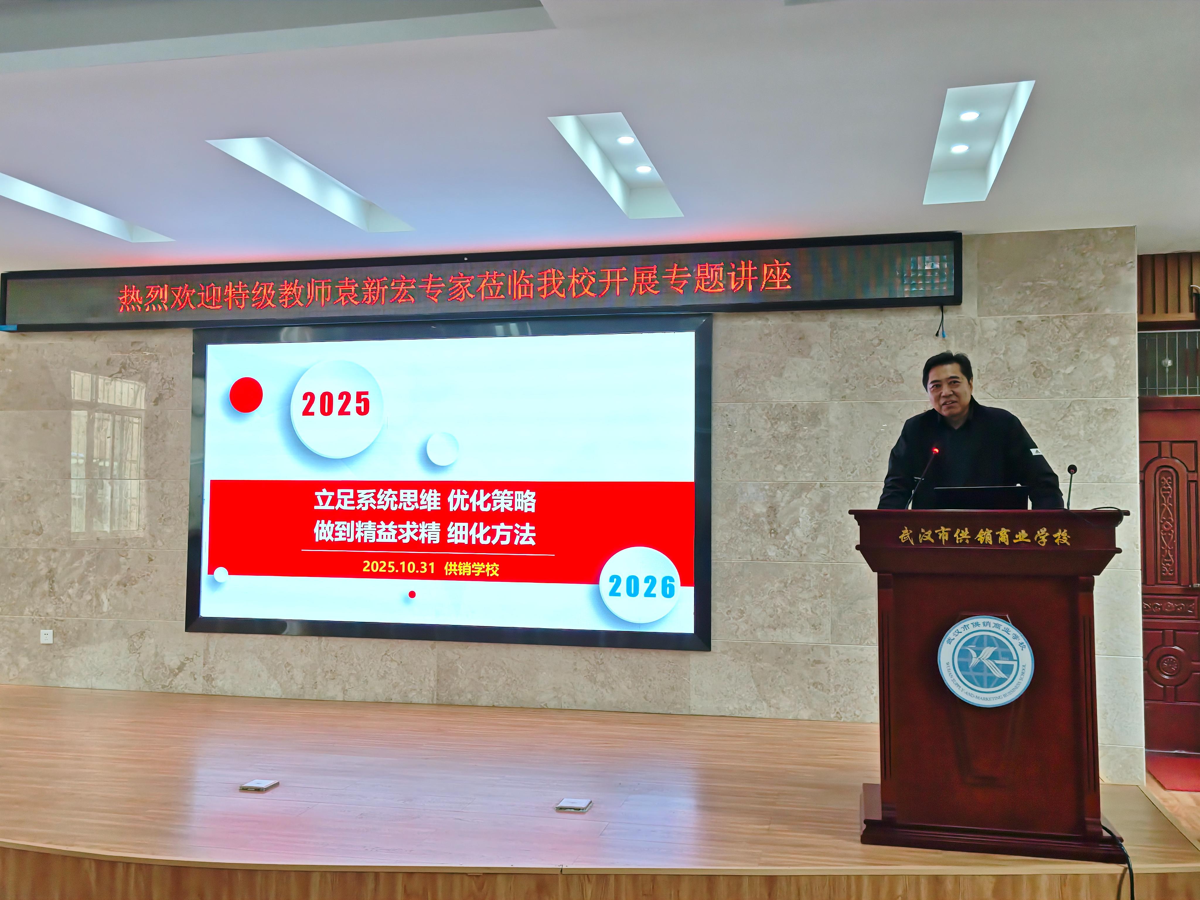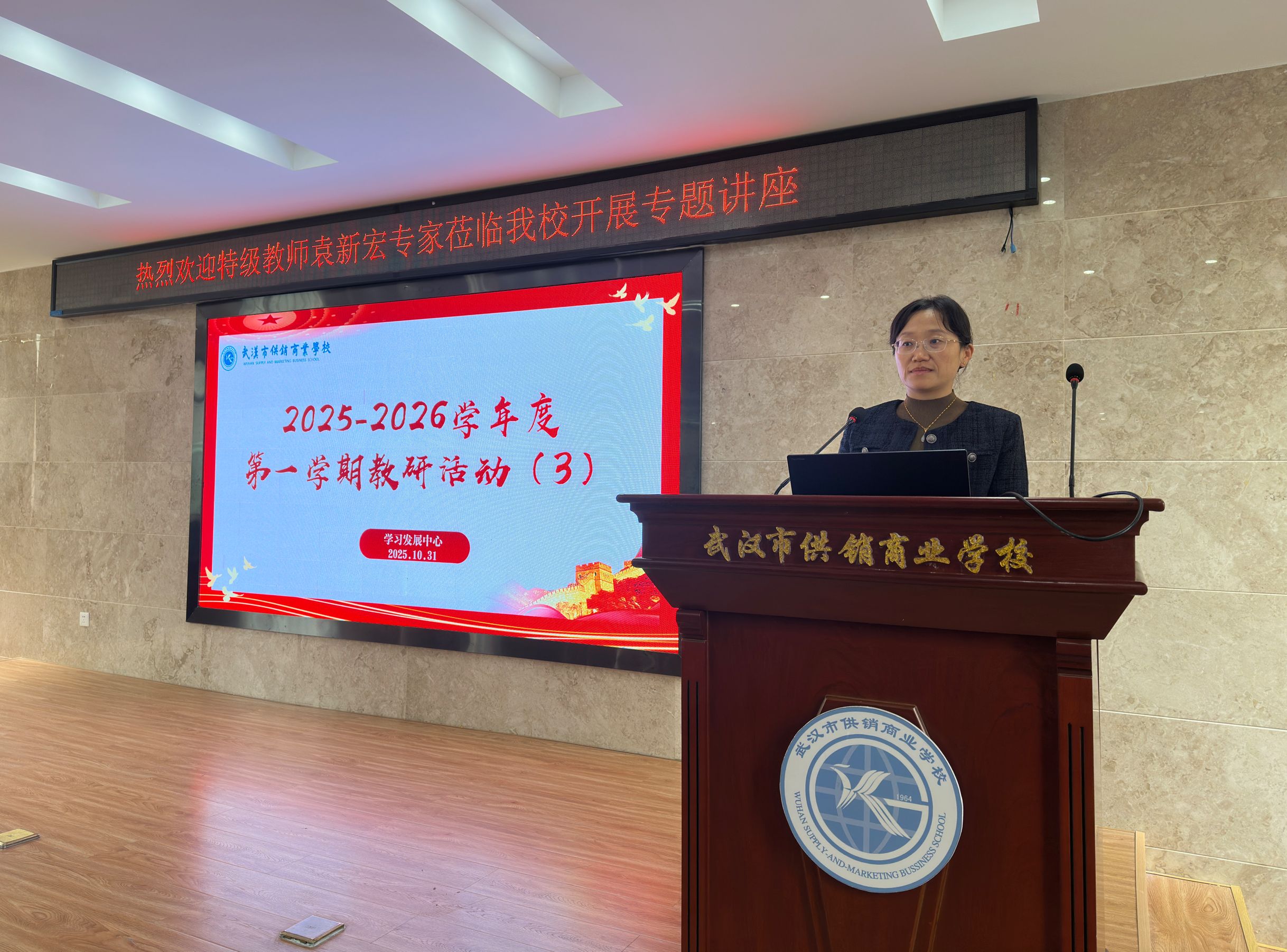 (通讯员 刘姣)金秋十月,丹桂飘香。10月31日,武汉市供销商业学校学术报告厅内群贤毕至,一场聚焦中职技能高考备考的专题教研活动在此隆重举行。特级教师袁新宏应邀莅临讲学,学生学习发展中心周艳红老师主持活动,全校教师齐聚一堂,共飨教育盛宴。