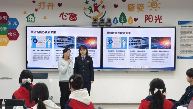 活动核心环节,税务宣传员戴子倩以 “AI 赋能智能办税:提升办税效率的创新实践” 为题,化身班级 “税务素养导师” 授课。她紧扣智慧税务建设部署,结合汉川税务基层实操案例,从传统办税 “服务时间受限、现场排队冗长、手工录入易错” 三大痛点切入,讲解 AI 智能办税的便民突破。通过动态演示 7×24 小时 AI 咨询平台 “秒级响应”、发票自动识别 “零人工干预”、报表智能校验 “分钟级办结” 等功能,让学生直观感受智慧税务简化流程、降低风险的优势。互动环节中,戴子倩结合企业办税案例,解答学生关于 “AI 税务数据监控应用” 等问题,助力学生将技术原理与便民服务要求结合。