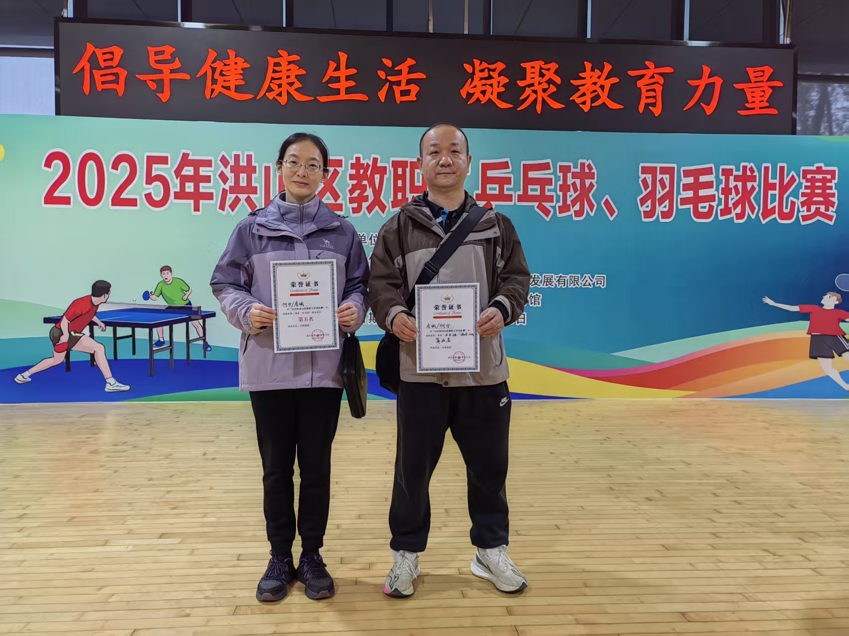 比赛中,选手们精神饱满,面对强劲对手,他们沉着冷静、灵活应变,每一次精彩对抗都赢得现场阵阵掌声。经过多轮激烈角逐,我校两支代表队分别斩获“洪山区教职工乒羽比赛混双第五名(詹斌、何宁)”;“丰华苑乒乓球争霸赛男单第三名(郑志文)”。