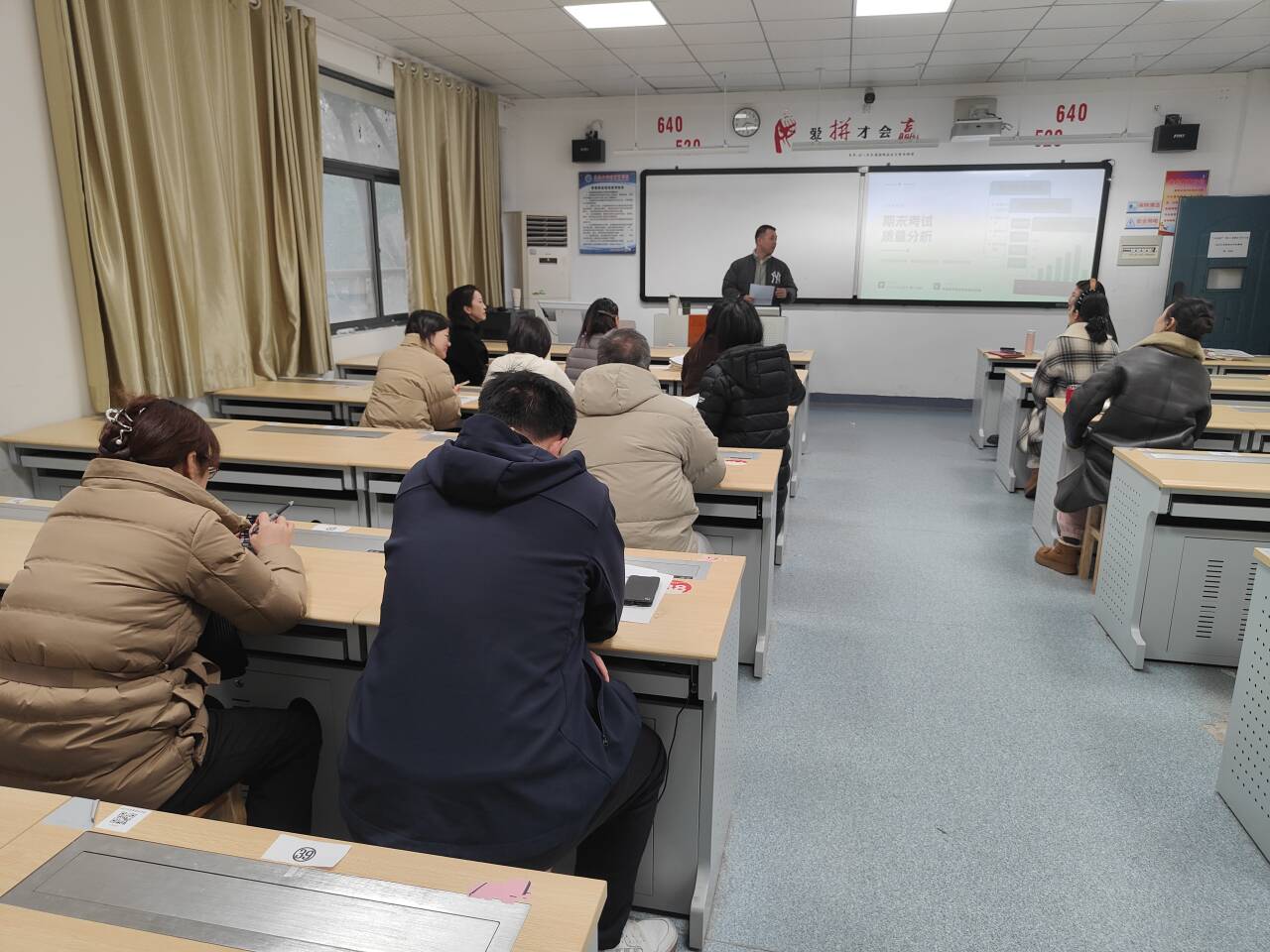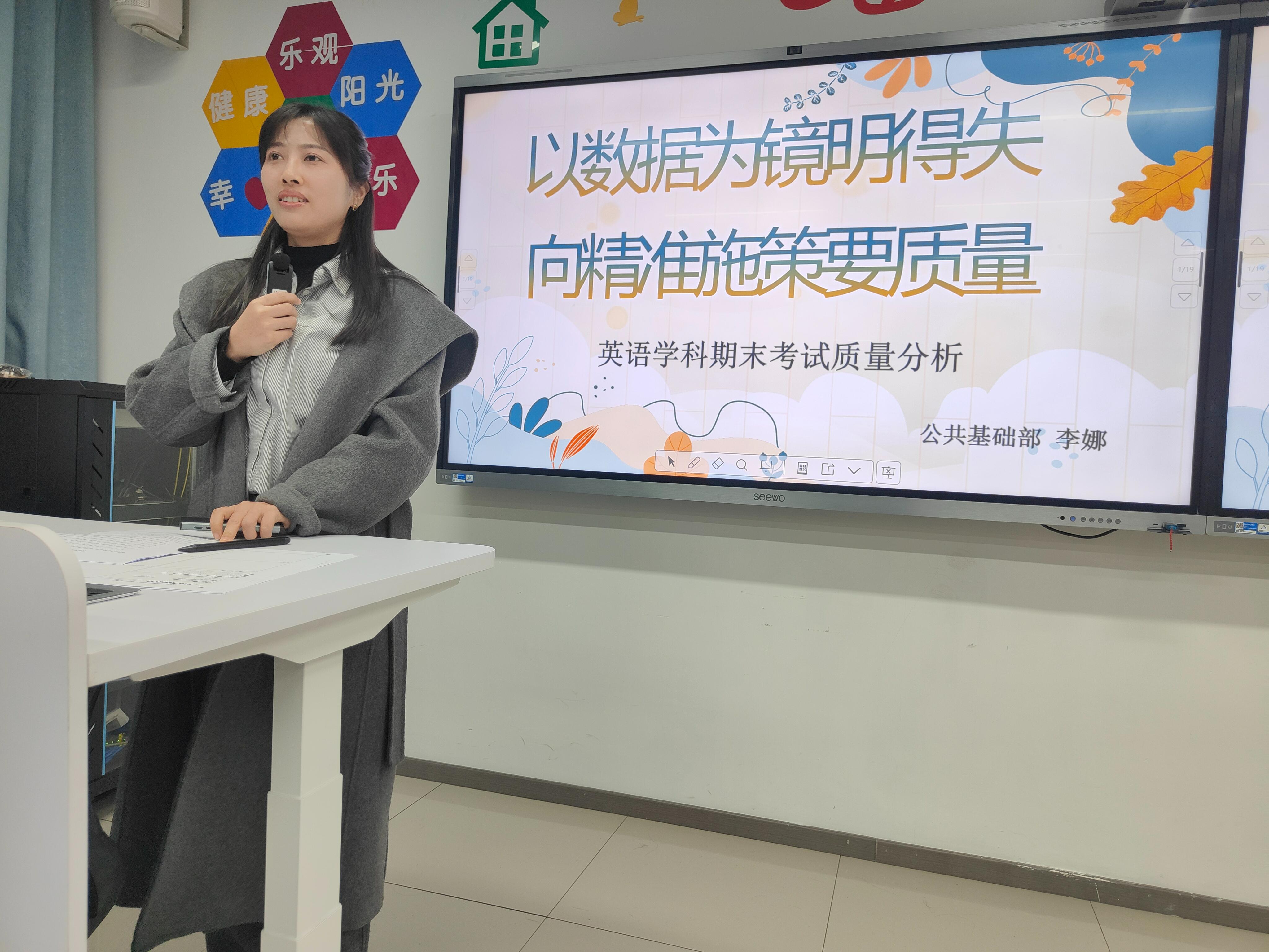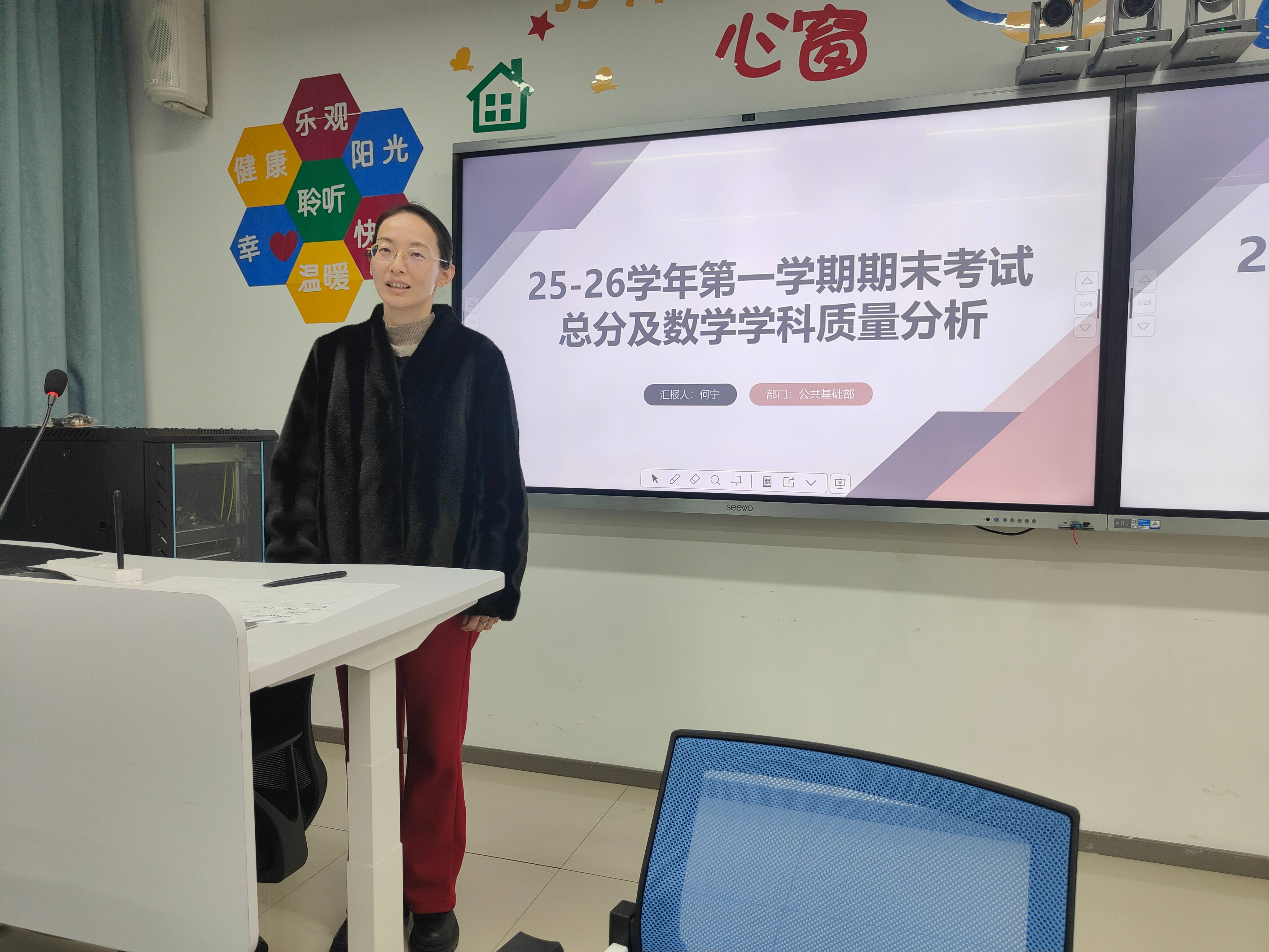 在2013教室,何宁主任对期末三个年级的文化课进行总体质量分析。何宁、王虹、李娜三位老师分别就期末数学、语文、英语三科质量进行深入分析。各位主讲人从试卷结构、成绩分布、典型错误、改进措施等维度展开,数据详实、分析透彻。张莹珺副校长作总结讲话,要求文化课教师关注学生基础能力培养,加强学科融合,提升教学针对性。