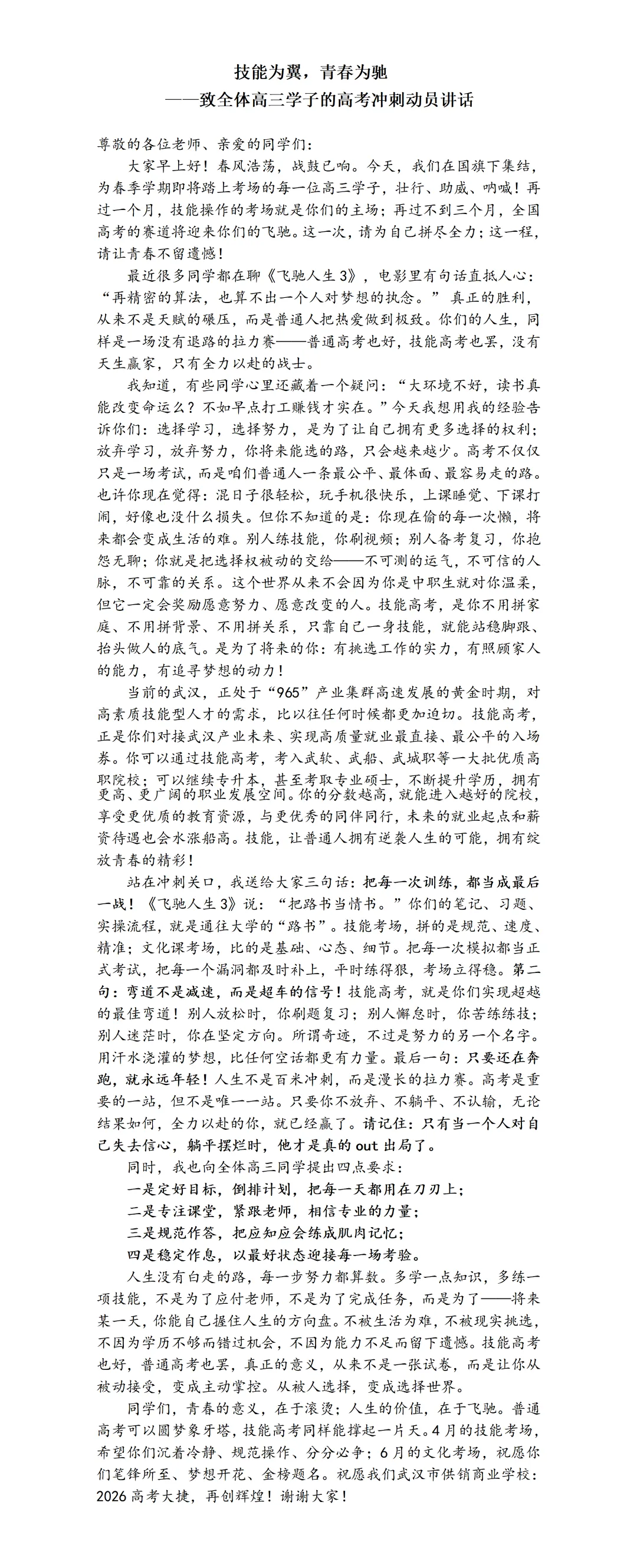 (通讯员 刘姣)春风浩荡,战鼓已响。3月9日,市供销商业学校在庄严的国旗下隆重举行2026年高考动员大会暨2025-2026学年第一学期期末表彰仪式,为即将踏上考场的全体高三学子壮行助威。张莹珺副校长发表题为《技能为翼,青春为驰》动员讲话,学习发展中心陈朝云老师主持,全校师生参会。