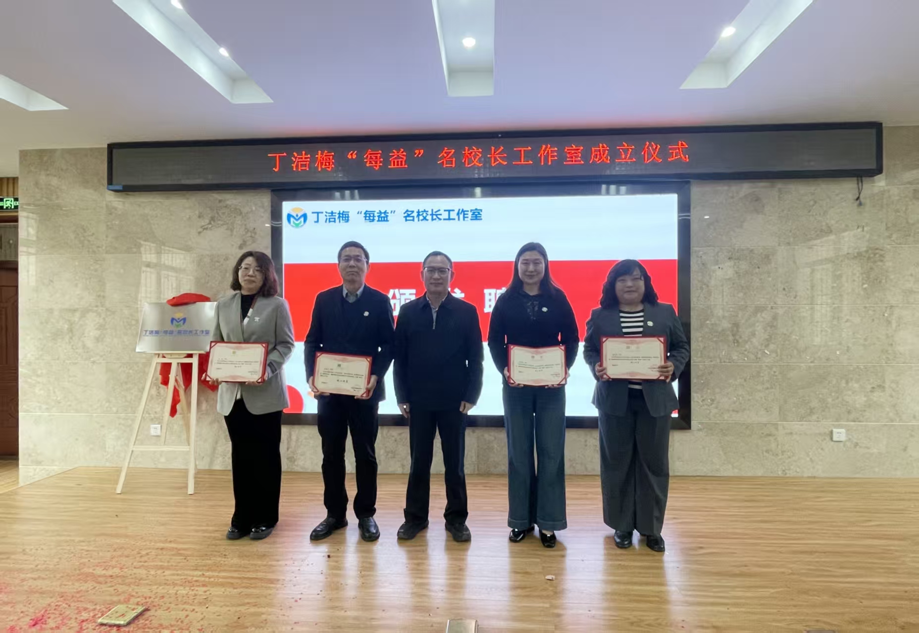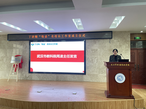 在全场热烈的掌声中,仪式迎来重要环节。市教育局职成教处处长李奇兵、市教科院职成室主任周凌共同为丁洁梅“每益”名校长工作室揭牌,红绸轻启,牌匾生辉,标志着工作室正式扬帆起航,开启武汉职教协同发展的新篇章。