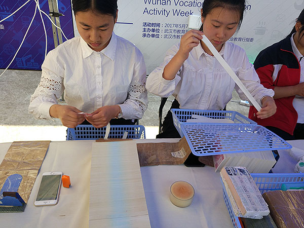 武汉市供销商业学校15会计专业学生田雪、郑丽英在技能周展会现场做点钞展示