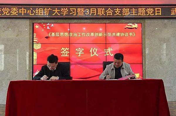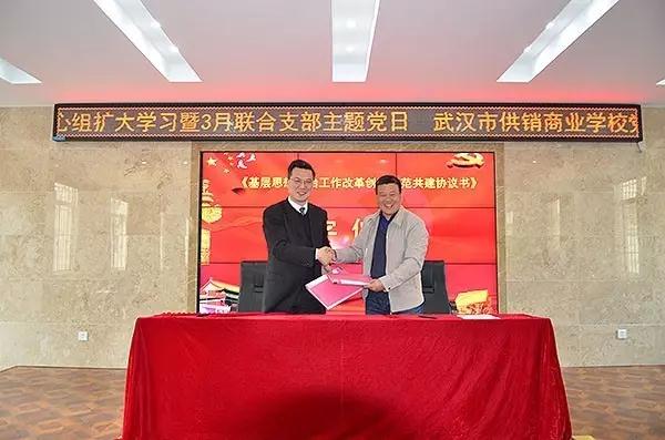 校园网消息(通讯员 责任编辑 李雄涛)2017年3月10日,市供销商业学校举行党委中心组扩大学习暨三月支部主题党日活动,市第十三次党代会代表、市人大代表、武汉外校党委副书记、校长王治高应邀为全校教职工宣讲市党代会精神,在市委教育工委宣传部指导与支持下,两校作为全市首批基层思想政治工作改革创新示范点,签定了《基层思想政治工作改革创新示范共建协议书》。