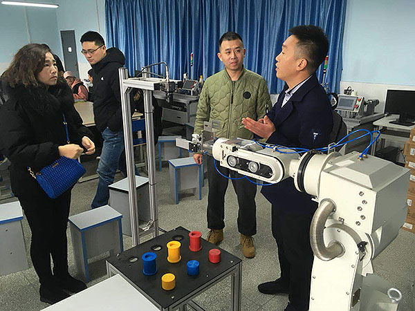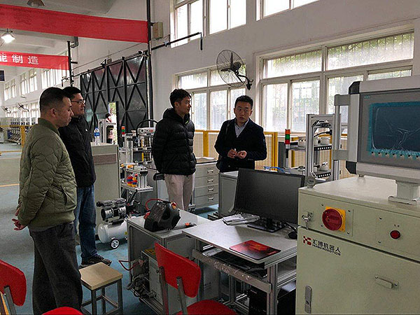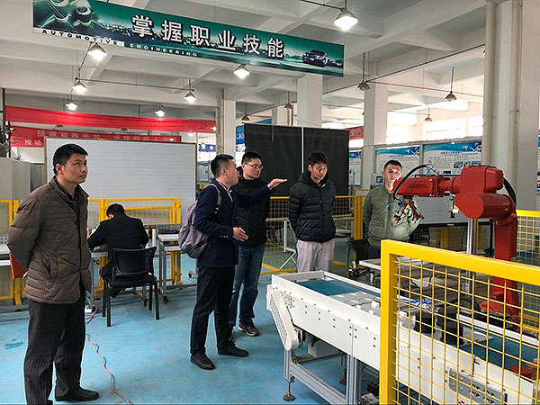 校园网消息(通讯员 徐薇薇 责任编辑 李雄涛)新学期伊始,武汉市供销商业学校信息服务专业部徐薇薇、彭丹主任带领专业教师一道,于2018年3月8日前往湖北科技职业学院机电石油工程学院进行工业机器人专业建设方面学习研讨交流。副院长汪超和工业机器人专业两位教师热情接待,并就工业机器人专业人才培养方案、课程开设和实训室建设等情况予以介绍,并针对武汉市供销商业学校特点在专业建设方面进行了宝贵意见和分析研讨。
