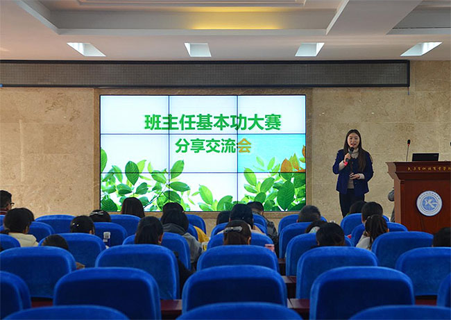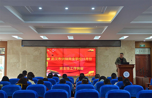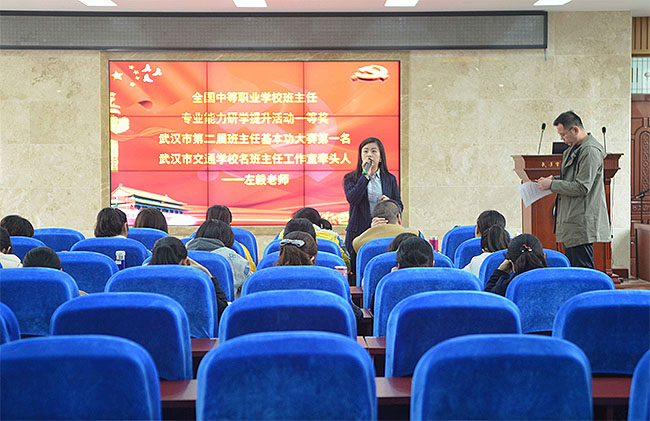 校园网消息(通讯员 詹斌 责任编辑 李雄涛 姚思)2018年11月30日星期五下午,武汉市供销商业学校全体班主任在学术报告厅齐聚一堂,召开班主任基本功大赛分享交流会暨11月份班主任工作例会,学工处李彤主任总结了11月份班主任工作并部署12月份班主任工作,丁洁梅副校长出席会议并总结发言。武汉市交通学校名班主任工作室牵头人左毅老师受邀作经验交流,左毅老师曾获得全国中等职业学校班主任专业能力研学提升活动一等奖、武汉市第二届班主任基本功大赛第一名。