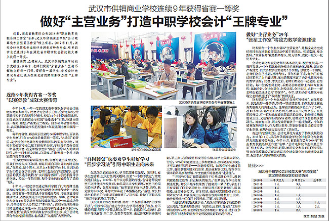 校园网消息(通讯员 姚思 责任编辑 李雄涛)2018年12月11日,长江日报在第五版“长江评论”专版报道:武汉市供销商业学校连续9年获得湖北省中等职业学校会计技能大赛一等奖,做好“主营业务”打造中职学校会计“王牌专业”。
