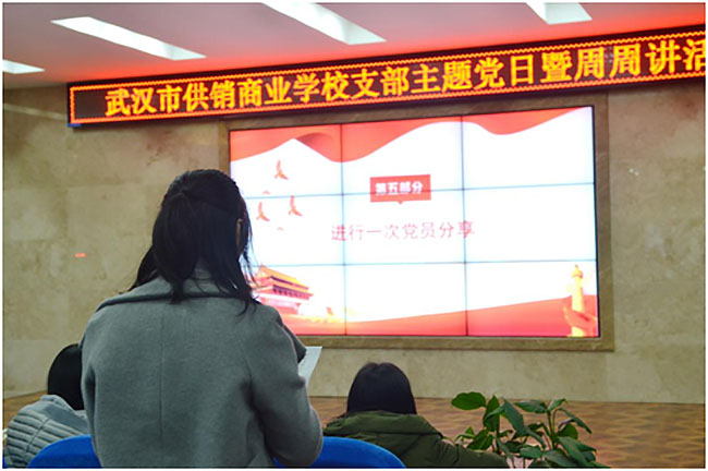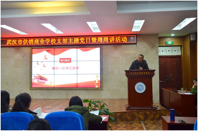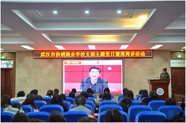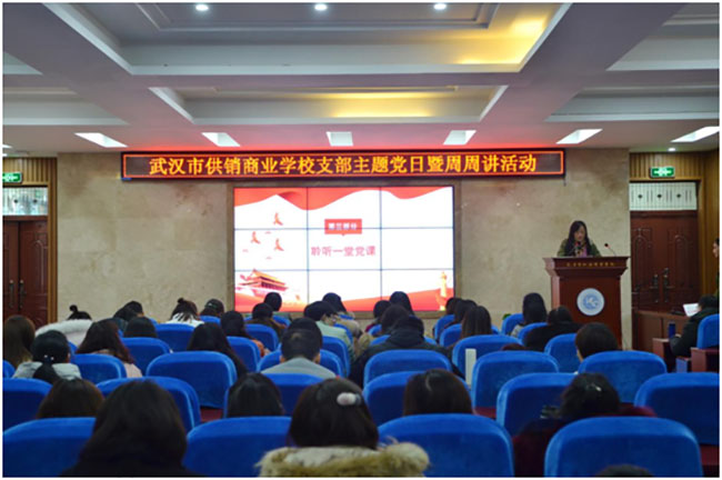 活动第三项,聆听一堂党课。今天党课的主讲人是武汉市供销商业学校第三党支部书记刘艳同志,刘书记结合习总书记在十九大上的重要讲话精神,联系老师们在本职岗位上的工作实际,她强调作为党员教师的我们,除了给学生传授最基本的文化知识,我们还要教会学生爱国、爱校、爱家,懂礼貌、讲道德、讲诚信、讲团结、有友爱、有友善,我们也将凝心铸魂,做好职教文化繁荣的传播者和传承者。