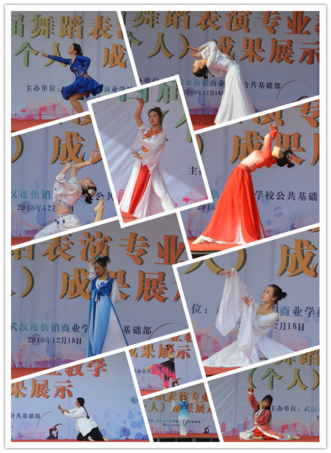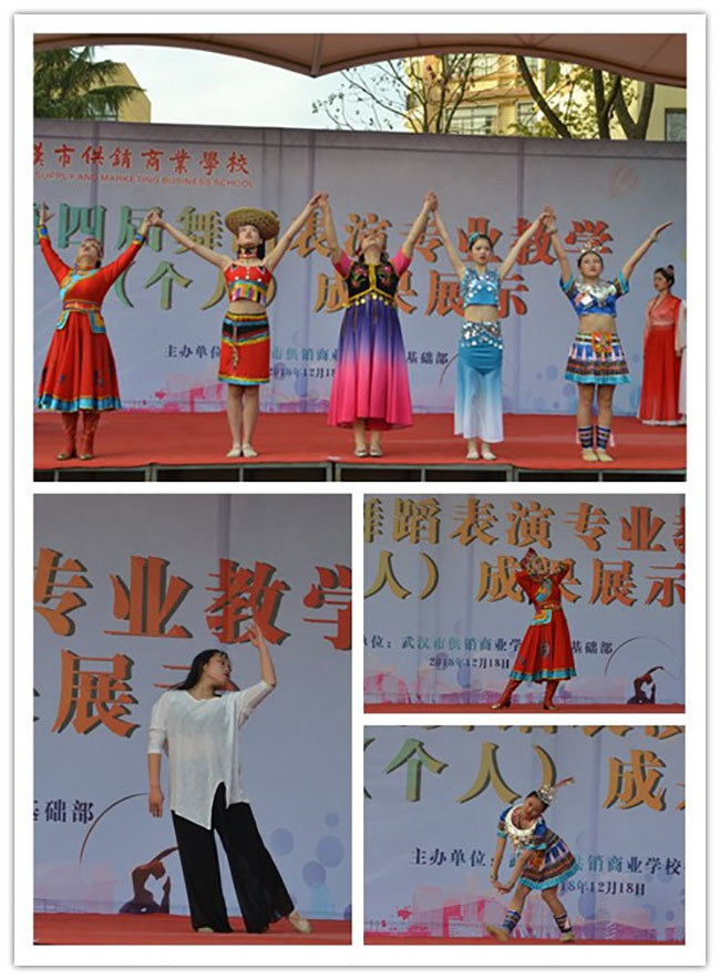 校园网消息(通讯员 刘艳 责任编辑 李雄涛 姚思)2018年12月18日下午,武汉市供销商业学校在运动场主席台举行第四届舞蹈表演专业教学个人成果展示,全校师生一起观看了本次由教务处主办、公共基础部舞蹈组承办、曾争老师负责指导的成果展示活动。共有27个舞蹈节目参加展示,全部由16级舞蹈专业的同学演出。