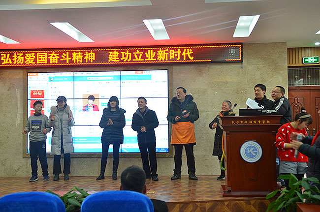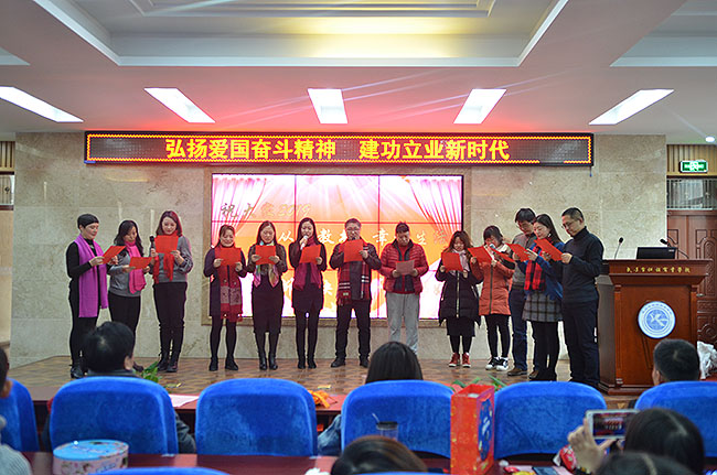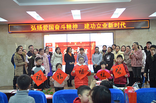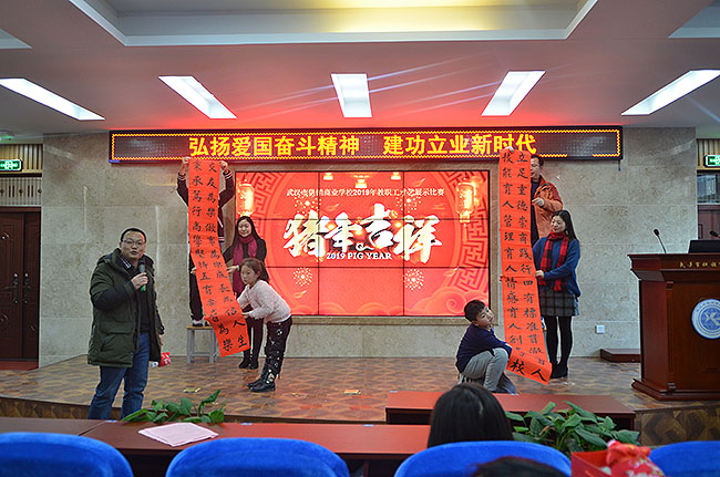 校园网消息(通讯员 何凤贤 责任编辑 李雄涛 姚思)踏歌起舞辞旧岁,凝心欢聚迎新年。在庆祝改革开放40周年之际,武汉市供销商业学校于2019年1月18日,在学术报告厅举办以“弘扬爱国奋斗精神 建功立业新时代”为主题的2019年迎新年会暨教职工才艺展示活动。全体教职工和部分教职工子女、为学校提供服务的相关企业领导、专家、技术人员参加了年会活动。活动由殷婷、夏玲玲、陈朝云、詹斌等四位老师主持。