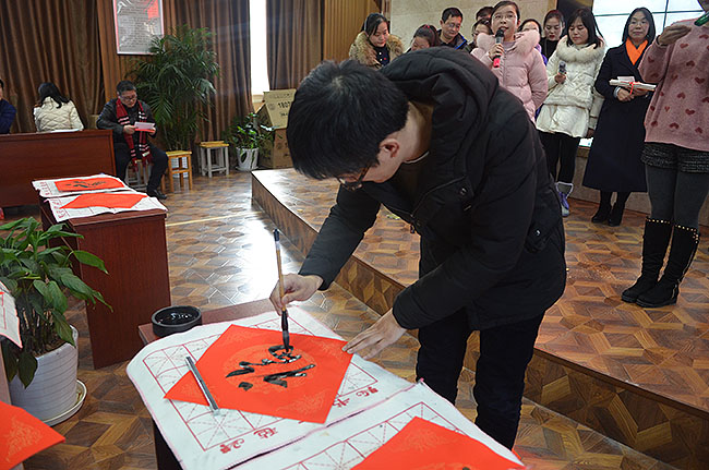 何云鹏老师现场书写五福,并由五个福娃为学校行政部门送来祝福。