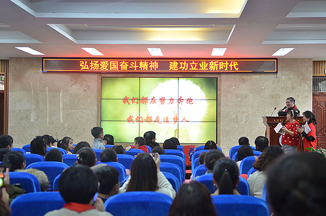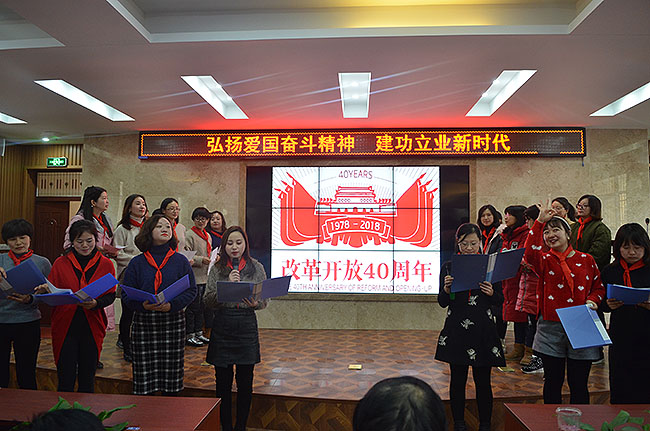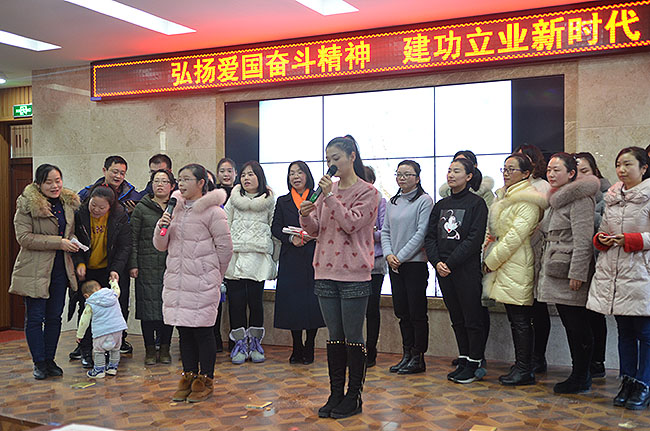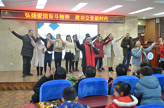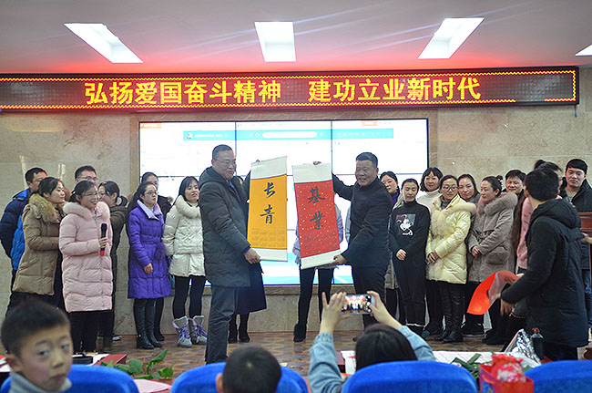 在庆祝改革开放40周年之际,2019年1月18日,我校在学术报告厅隆重举办2018年工作总结暨2019年年会。本次年会主题是,颂扬爱国奋斗精神 建功立业新时代。参加年会的有校领导班子成员王涛、沈校、鄢鸣、丁洁梅以及全体教职工和部分子女,特别邀请新五星公司负责人曾经理、阳光物业负责人陈经理参加活动。年会由殷婷、夏玲玲、陈朝云、詹斌等老师主持