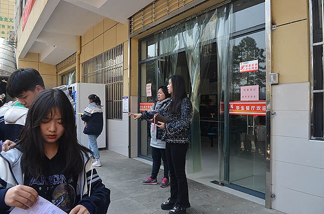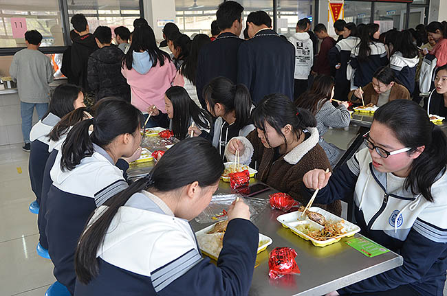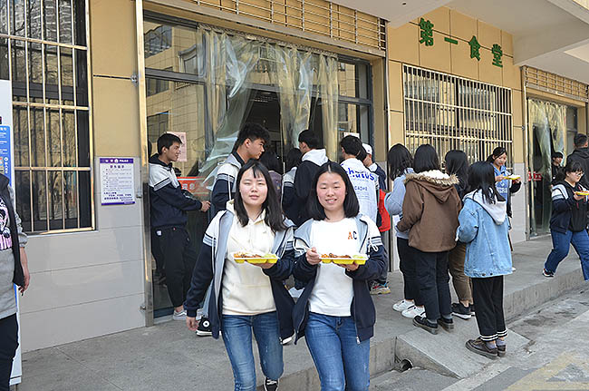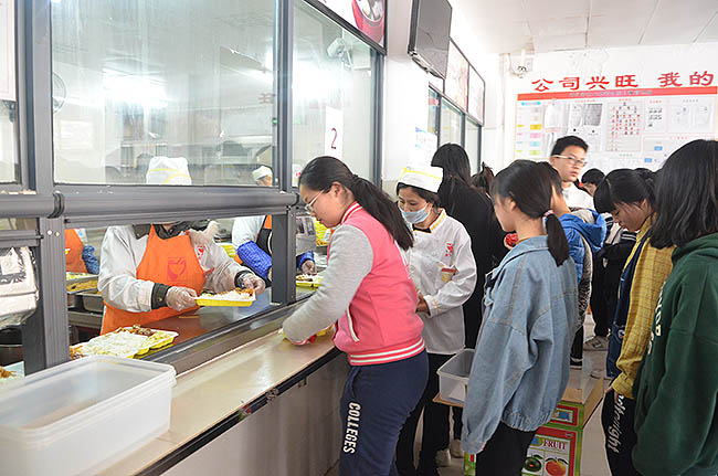 中午12点下课铃响后,同学们在学生工作处老师及教官团队的指引下,以班级为单位,有序进入食堂,面带欣喜排队就餐。