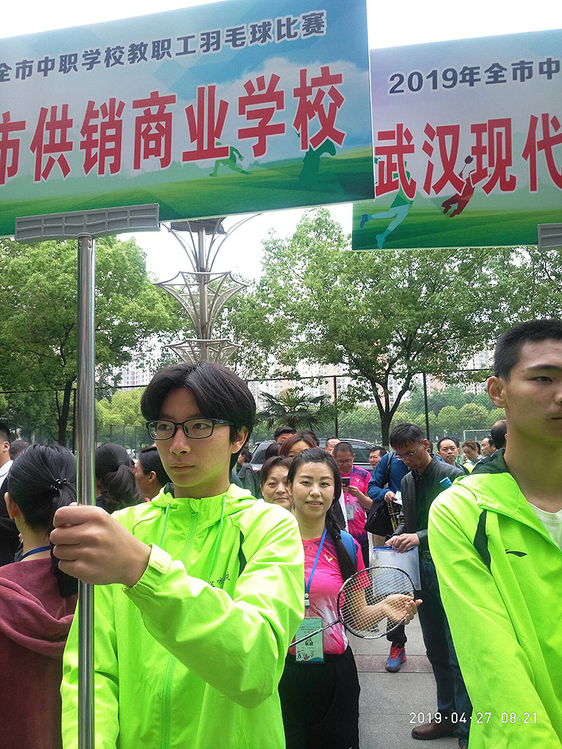 校园网消息(通讯员 何凤贤)武汉市中等职业学校教职工“与军运同行”羽毛球比赛于2019年4月27日上午8:30在市体育运动学校羽毛球馆举行开幕式,市教育局副局长田文江、教育工会主席许芬、职成处处长李万平等领导出席开幕式,9:00田文江副局长宣布开赛声中,比赛拉开序幕,来自全市中职35所学校的代表队参加了比赛。