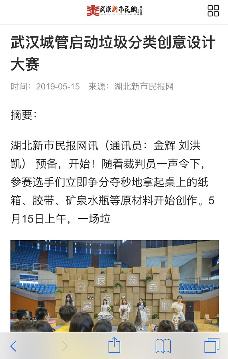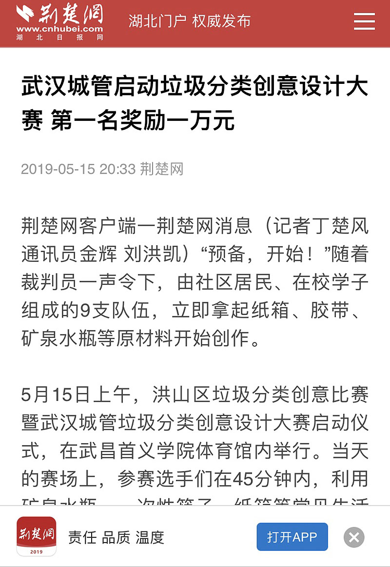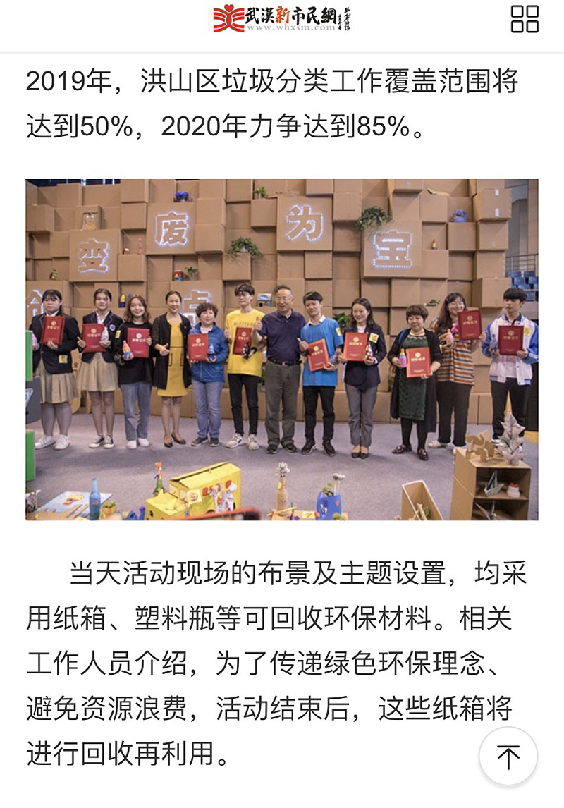 校园网消息(通讯员 徐薇薇)2019年5月15日上午,由武汉市城市管理执法委员会主办,洪山区城市管理执法局垃圾分类专班协办的“清洁家园迎军运 垃圾分类我先行 ‘变废为宝’创意制作大赛“隆重开幕。武汉市城市管理执法委员会信息宣传教育处处长叶志卫、洪山区城市管理执法局副局长严庆平、我校党委书记王涛莅临活动现场,现场还有垃圾分类专家、手工艺达人、以及我校及多所高校师生们参加活动。