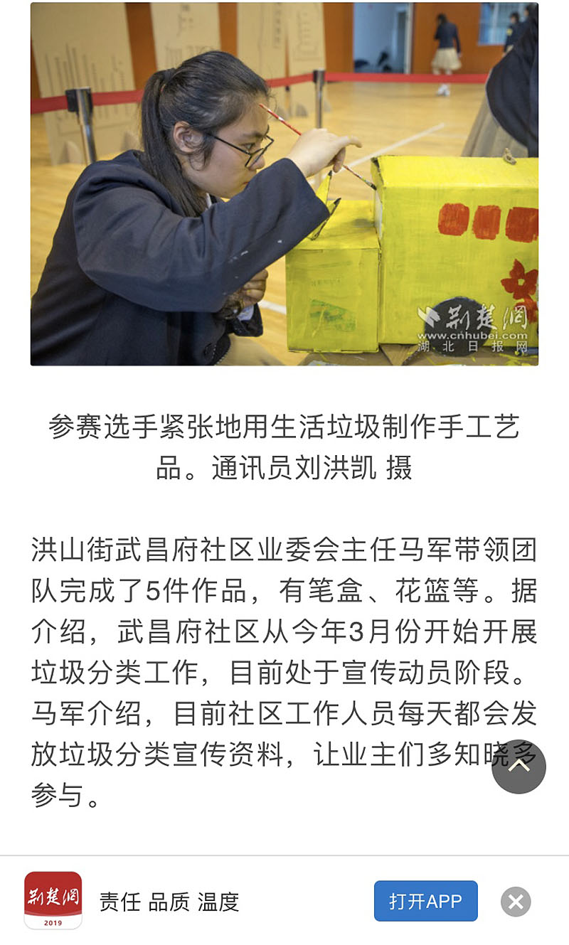 本次与我校同场竞技的还有洪山街武昌府社区代表队、梨园街东湖社区代表队、武昌首义学院代表队(2支)、中南民族大学代表队、湖北交通职业技术学院代表队等多支手工达人队伍,现场进行“变废为宝”创意制作大比拼。