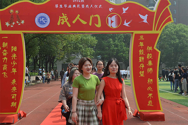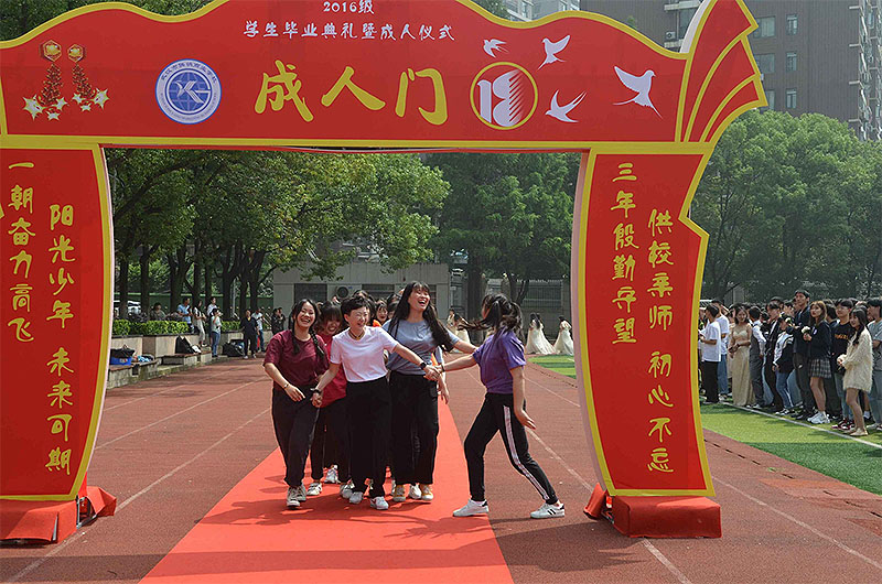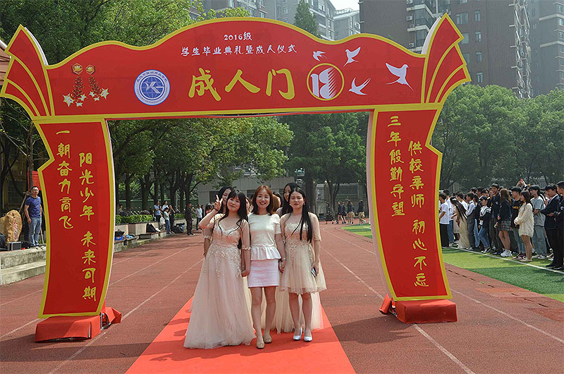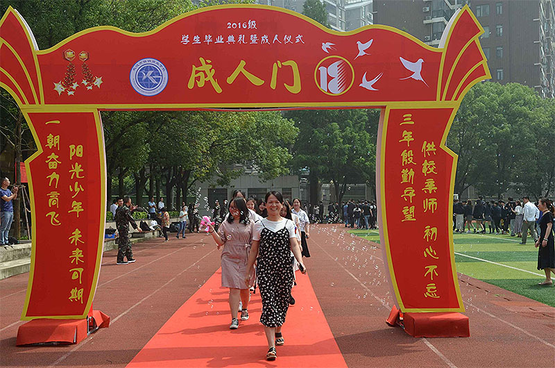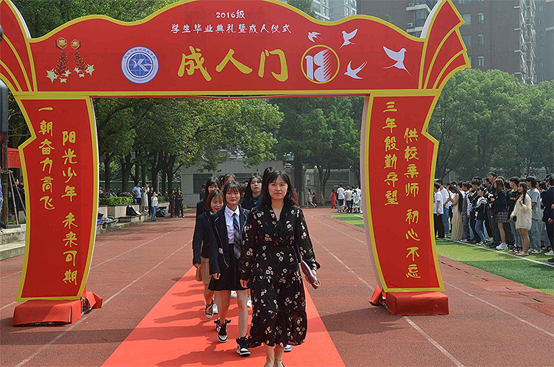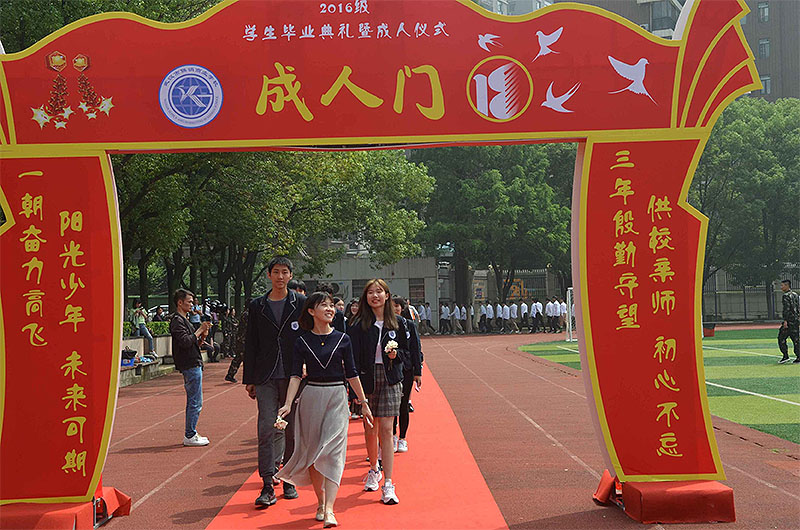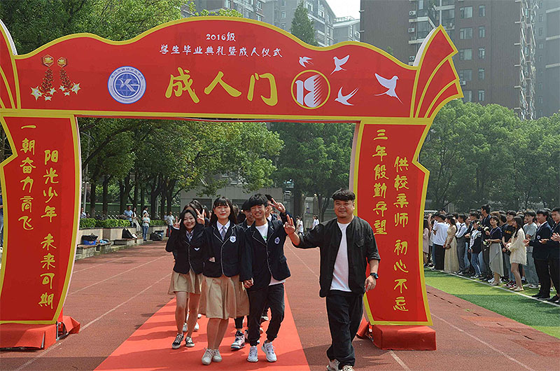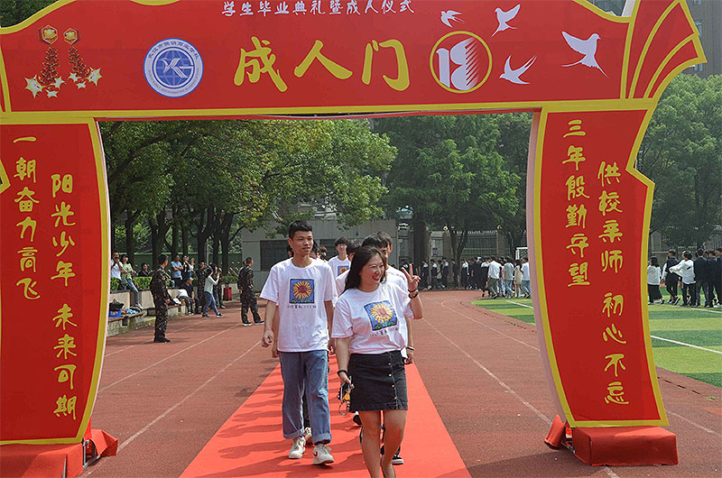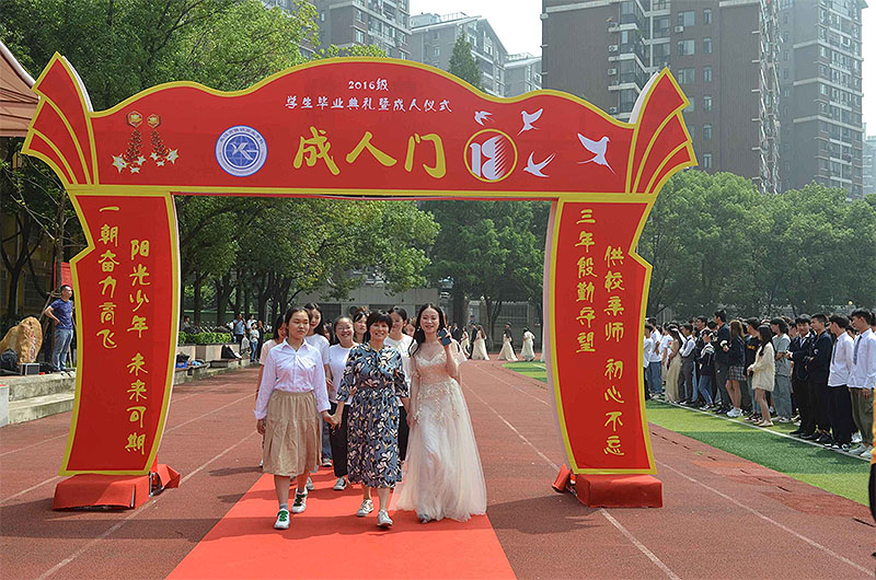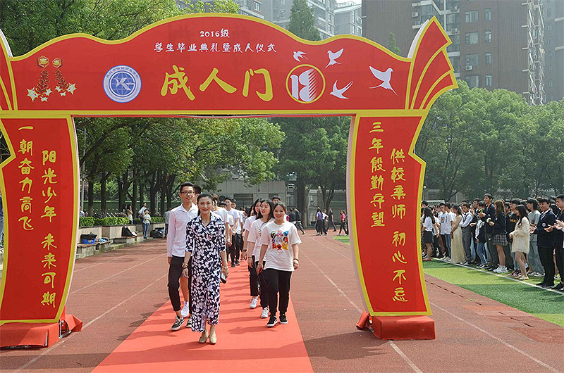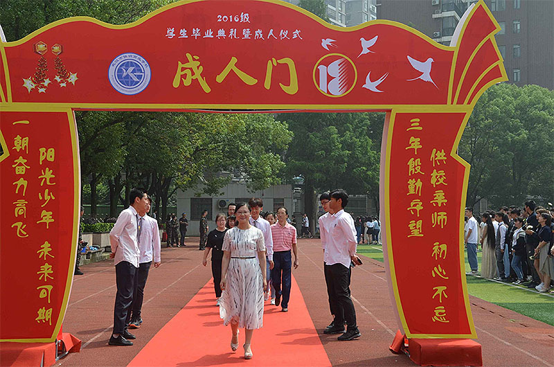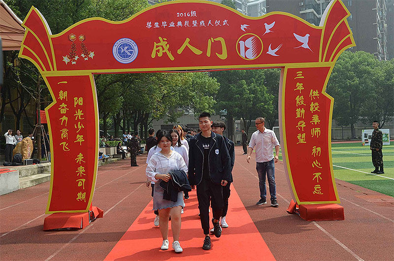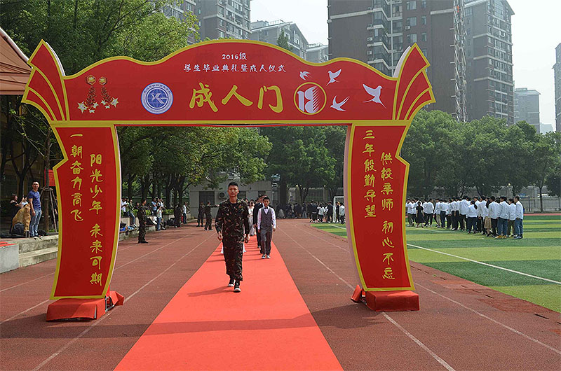 上午十点,毕业典礼在悠扬的乐曲声中拉开序幕,毕业生们以“自信、昂扬”的姿态在班主任的带领下,在全体师生、家长的共同见证下踏着红毯穿过“成人门”进入会场——十八岁意味成熟长大、意味着感恩和责任,从此,16级学子们站在了人生新的起跑线上。