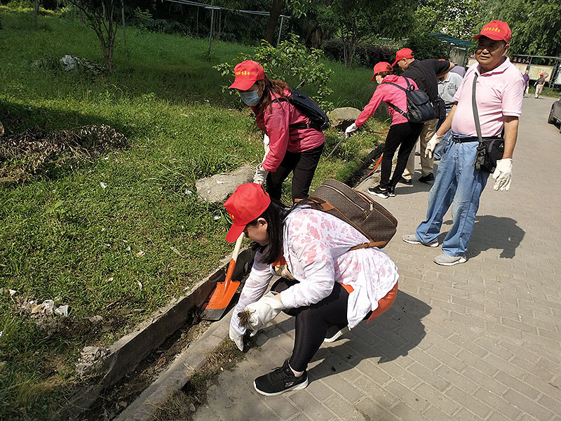 党员代表同志们携带手套、铁锹、扫帚等清洁工具,在社区工作人员的带领下,来到东方花城小区,首先对小区内的阴沟进行清理,接着清理了绿化区域里的杂草和垃圾,大家虽然大汗淋漓,却都以劳动为荣,为筹备军运会乐在其中。