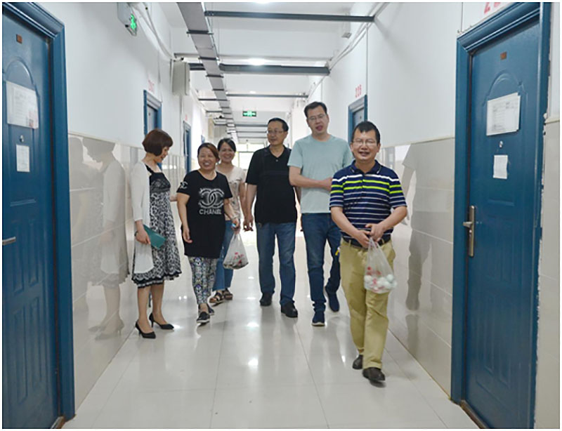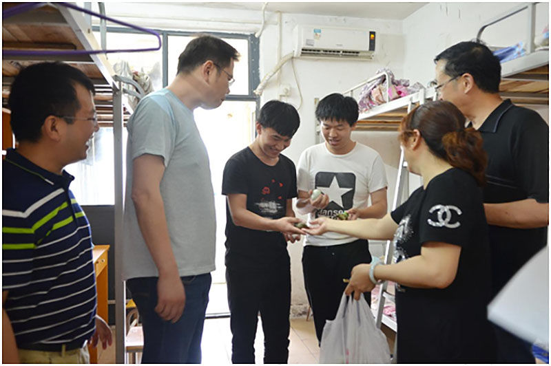 第五党支部全体党员在支部书记姚喆同志和学工处李彤主任的带领下,来到学生公寓楼看望和慰问“端午节”留守学生,给同学们带来了热气腾腾的咸蛋和粽子,也带来了学校和全体老师对同学们的深情祝福。