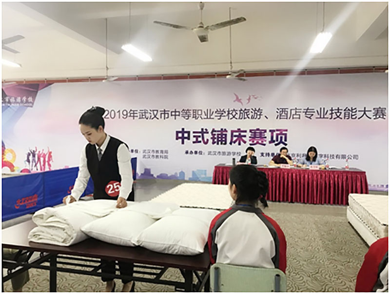 中式铺床项目则要求选手在3分钟内完成床单、被套、羽绒被和枕头的铺放工作,其中最难的是独立完成套被子工作。市赛标准同国赛标准是一样的,床单中间、枕头中线、被套离地距离、枕线偏差必须控制在2cm以内。