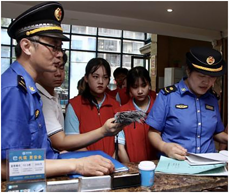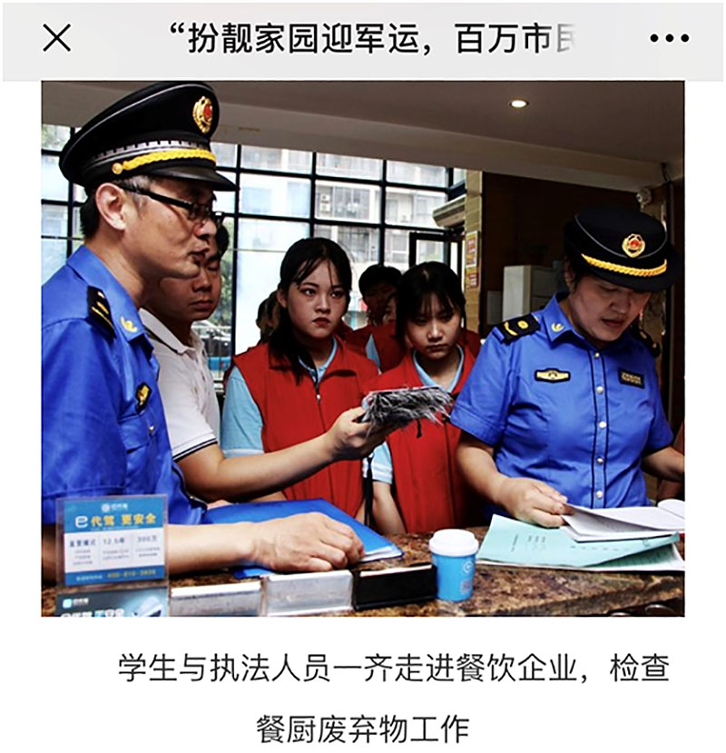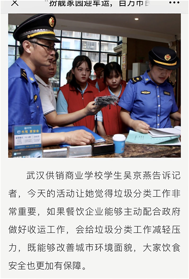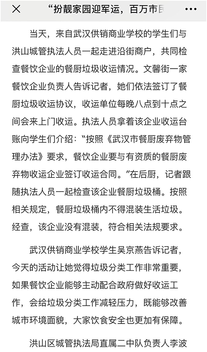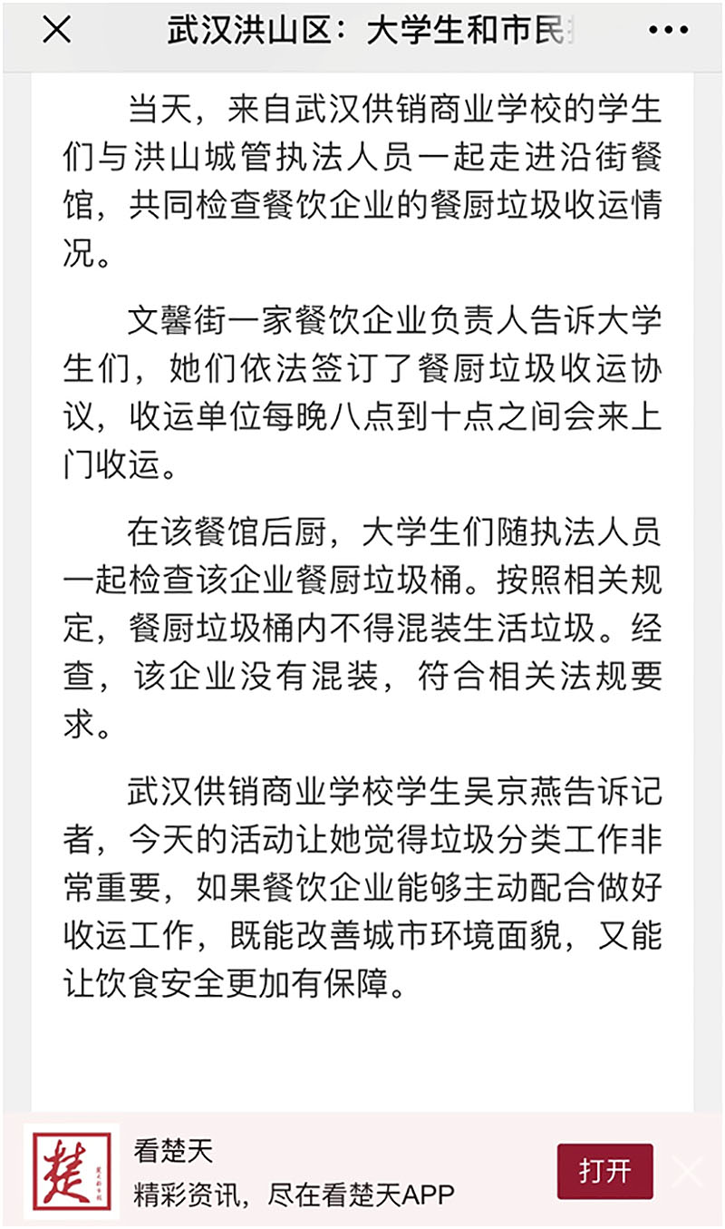现场活动结束后,我校学生们与洪山城管执法人员一起走进沿街商户,共同检查餐饮企业的餐厨垃圾收运情况。文馨街一家餐饮企业负责人告诉记者,她们依法签订了餐厨垃圾收运协议,收运单位每晚八点到十点之间会来上门收运。执法人员拿着该企业收运台账向学生们介绍:“按照《武汉市餐厨废弃物管理办法》要求,餐饮企业要与有资质的餐厨废弃物收运企业签订收运合同。”在后厨,记者跟随执法人员一起检查该企业餐厨垃圾桶。按照相关规定,餐厨垃圾桶内不得混装生活垃圾。经查,该企业没有混装,符合相关法规要求。