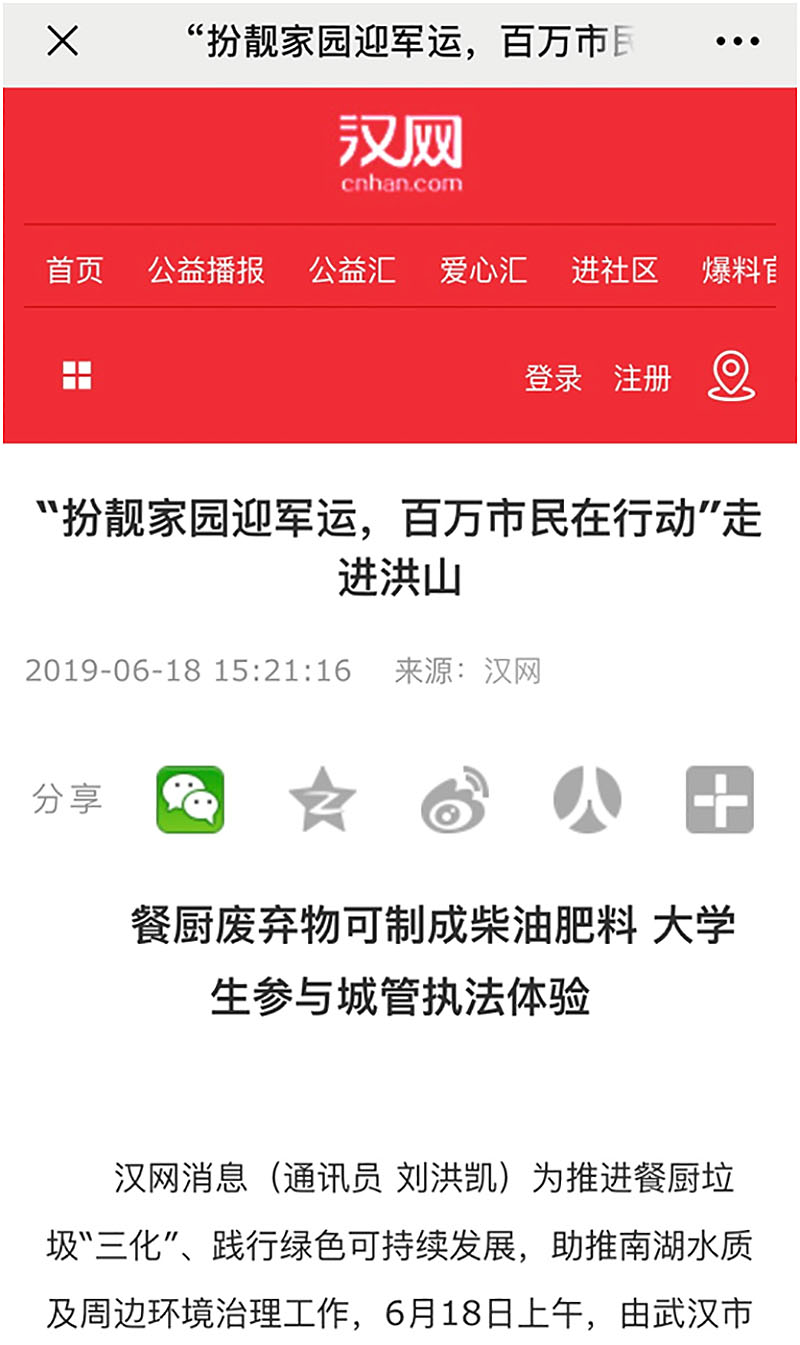 (通讯员:徐薇薇)为推进餐厨垃圾“三化”、践行绿色可持续发展,助推南湖水质及周边环境治理工作,2019年6月18日上午,由武汉市城管执法委主办、洪山区城管执法局承办的“扮靓家园迎军运、百万市民在行动”主题活动在洪山区书城路幸福湾公园举办。我校信息服务部徐薇薇主任和刘正熹老师带领着17酒店班和18计算机1班的优秀学生代表参加了活动。