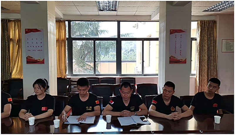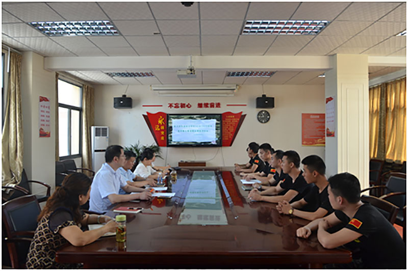 学工处李彤主任主持会议。武汉市大将公司住校总教官胡粤威作工作情况汇报,公司负责人王亮补充发言,学工处李彤主任作点评。
