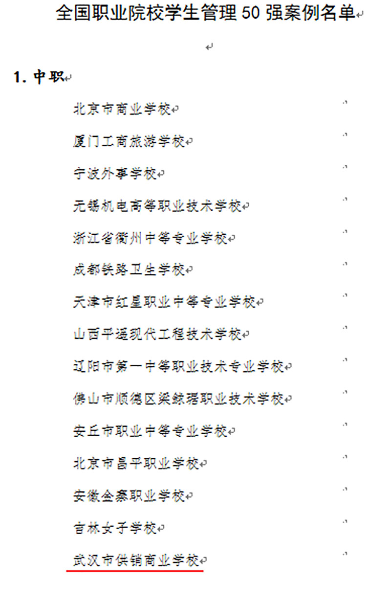 武汉市供销商业学校继2010年荣获全国中职德育工作先进集体之后,今年获评全国职业院校学生管理50强案例。学校始终秉承“一切为了学生,一切为了让学生及家长满意”的办学理念,践行“重德崇商”的校训,“亲情管理,成功教育”德育工作,打造“雅商行动计划”的德育品牌。