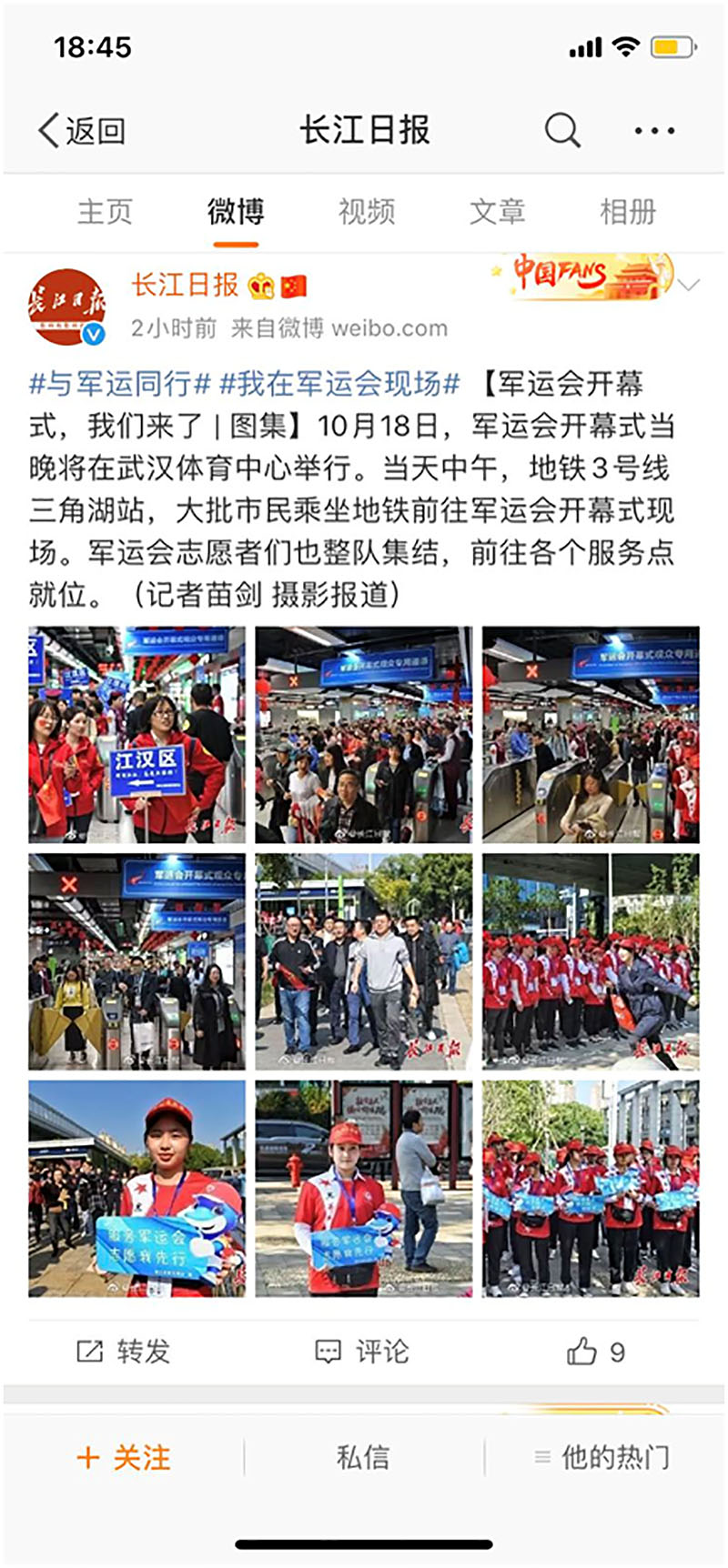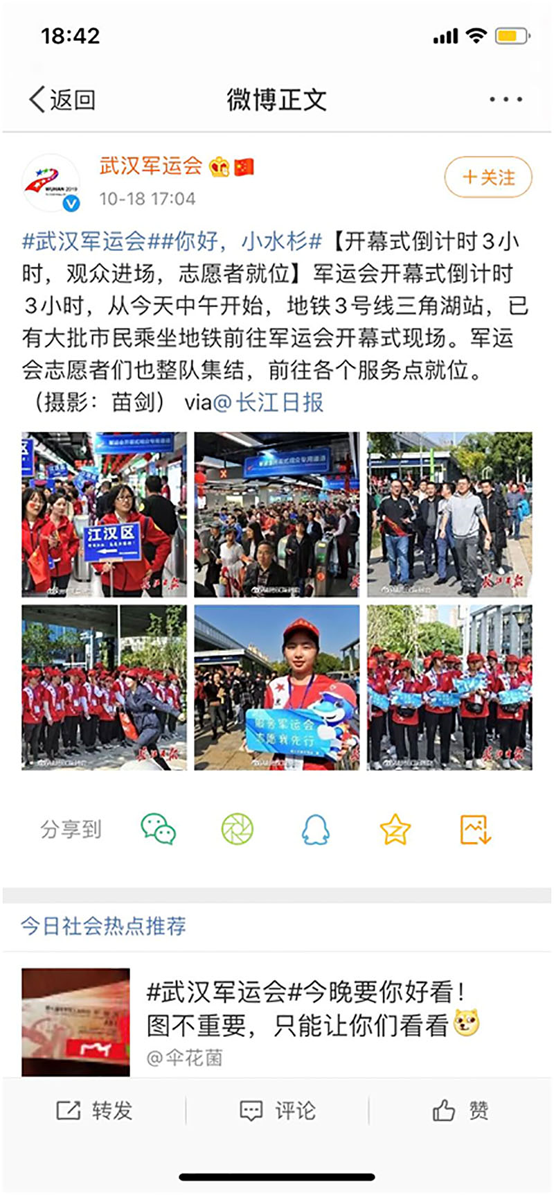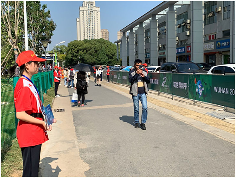 校园网消息(通讯员李雄涛)应武汉市文明办、硚口区文明办邀请,我校选派100名学生参加武汉军运会志愿服务工作。我校学生志愿者负责从三角湖地铁站至新民河之间观众入场通道引导工作,学生优质的志愿服务得到了武汉市文明办、武汉市教育局、硚口区文明办以及现场观众的一致好评。军运会官方微博、长江日报、文明武汉等新闻媒体报道我校青年志愿者服务军运概况。我校服务军运青年志愿者得到上述媒体、上级领导及观众高度肯定。