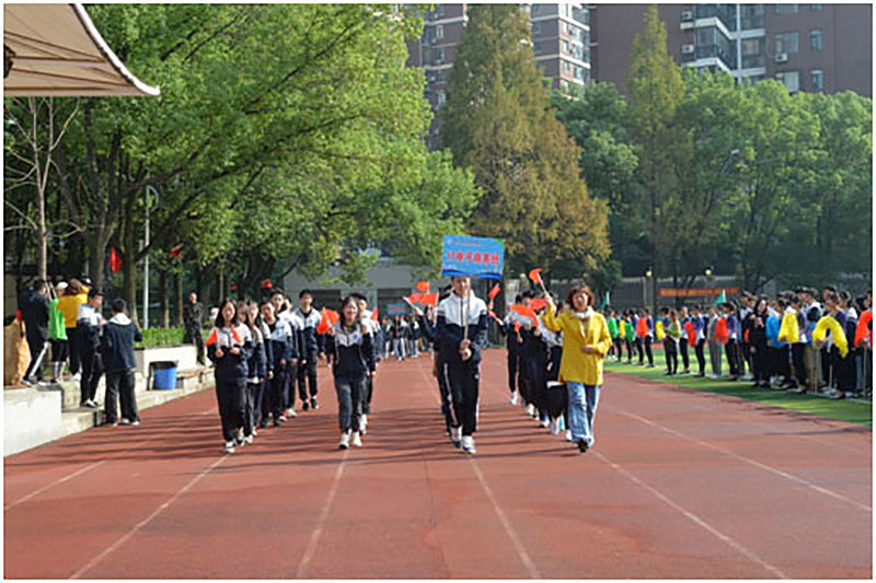 各班运动员以嘹亮的口号、整齐的步伐进入运动场。入场式由19会计3班刘晶、胡宗耀、18电商班蒋翔、18计算机1班肖伊同学主持。沈敏校长致开幕辞,在讲话中沈校长对我校体育工作成绩给予了肯定,并希望运动员们团结拼搏,争创佳绩,以优异的成绩为军运会献礼。
