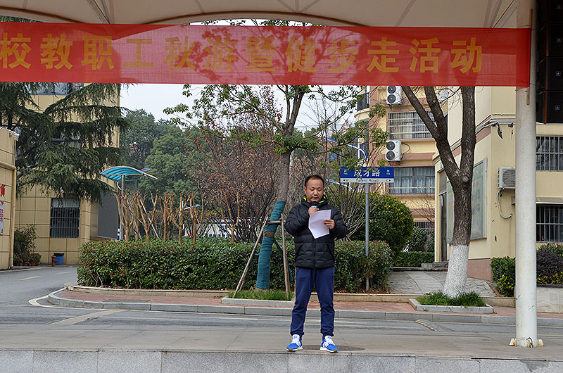 主持人詹斌老师给大家介绍了健步走活动的意义以及具体安排。在欢快的音乐声中,彭敏老师带领大家做起热身活动,防止大家在活动中受伤。工会主席鄢鸣宣布“武汉市供销商业学校秋游暨健步走活动开始”,带领全体教职工出发。