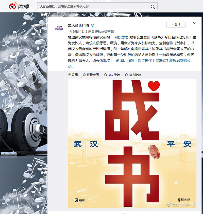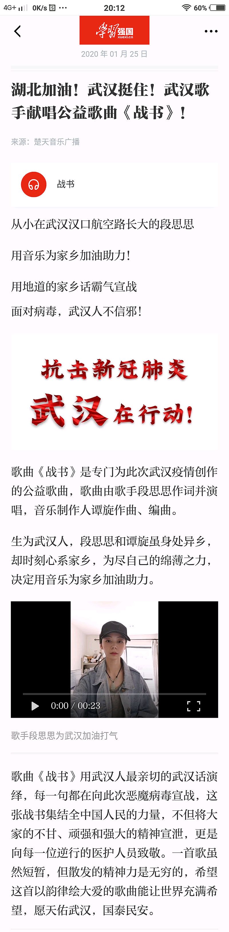 校园网消息(通讯员 施四维)武汉市供销商业学校毕业生段思思在此次武汉疫情来势汹汹的情形下,情系家乡创作为武汉加油公益歌曲《战书》,被“学习强国”学习平台收录。