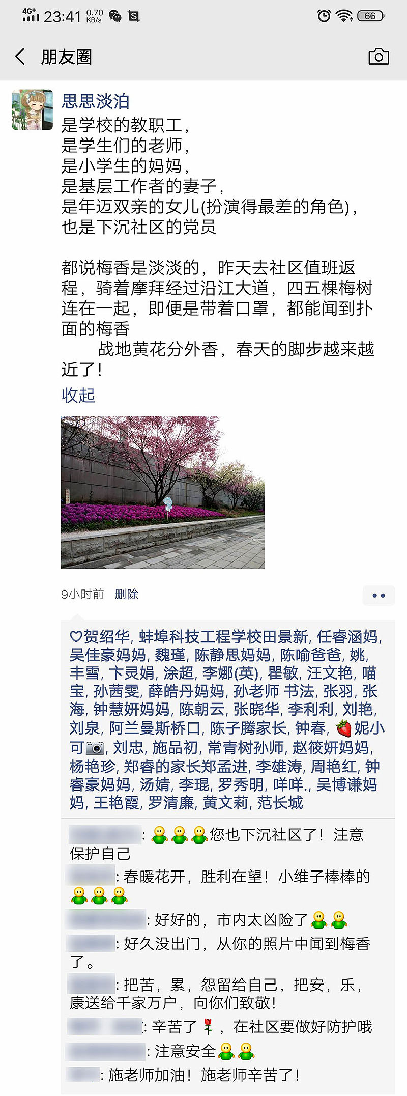 “下班”时卞老师的家人开车来接她,他们盛情邀请我坐车,但我还是婉拒了。回家的路程感觉比去时快,因为心情真的还不错!继续摩拜骑行回家,路上看到江边的梅花开了,几株梅树在一起,即便戴口罩都能闻到梅花香,我还拍了一张照片,心情更加畅快了!
