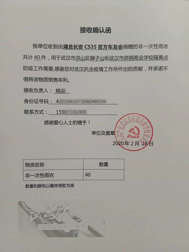 此外,枫林上城社区和湖北长安CS35官方车友会了解到相关情况后,分别向我校捐赠了医用口罩300只、N95口罩10只、加厚手套200双、医用手套300双、防护服2套、护目镜2套、40件非一次性雨衣等物品,用于防疫工作。