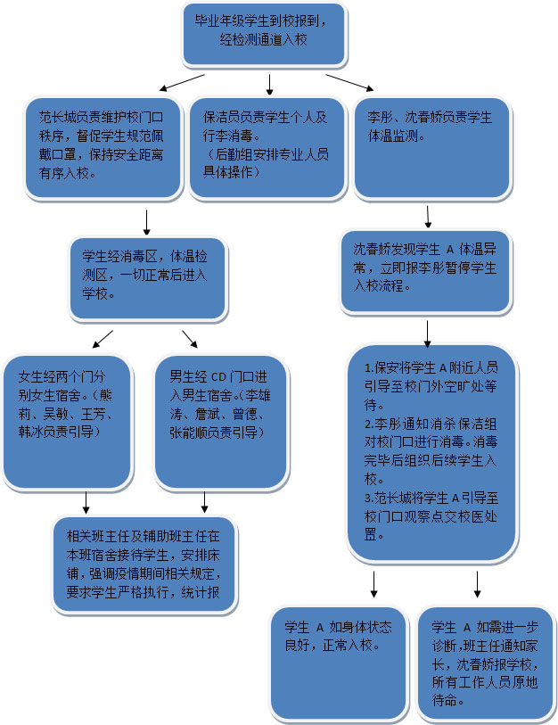 学校大门设置体温检测门,体温晨午晚检组负责维护学校门口的秩序,提醒师生进校时保持安全距离,检查师生佩戴口罩,扫码登记及体温情况。消杀保洁组对学生及其行李进行消毒。后勤保障组负责校门口防疫应急物资保障,及时安排重点位置的清洁消杀工作。教育教学组负责引导学生按指定路线进入宿舍,班主任及辅导员在宿舍组织本班学生整理内务。