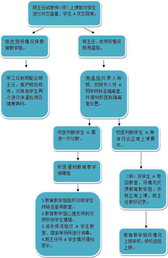 (2)发现A同学状态异常,班主任或科任教师立即报教育教学组,由学工处派人将A同学带到教学楼隔离室(相关人员做好自我防护),并通知校医在隔离室对A同学进行专业处置。(如发生学生呕吐,立刻转移全班学生至备用教室,并在校医指导下由专人清理呕吐物)