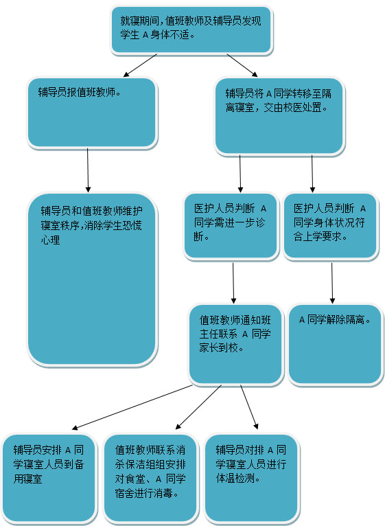 (2)发现A同学状态异常,辅导员立即将A同学带到隔离寝室(相关人员做好自我防护),并通知校医在隔离寝室对A同学进行专业处置。(如发生学生呕吐,立刻转移全班学生至备用寝室,并在校医指导下由专人清理呕吐物)