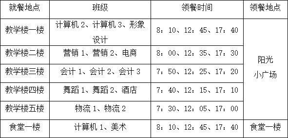 5.取餐方式:各班安排四名学生在规定的时间到食堂门口取餐。(天晴,取餐地点设在食堂门口停车场,避免进室内,配备方便搬运的篮筐和拖车,供需要的班级使用)