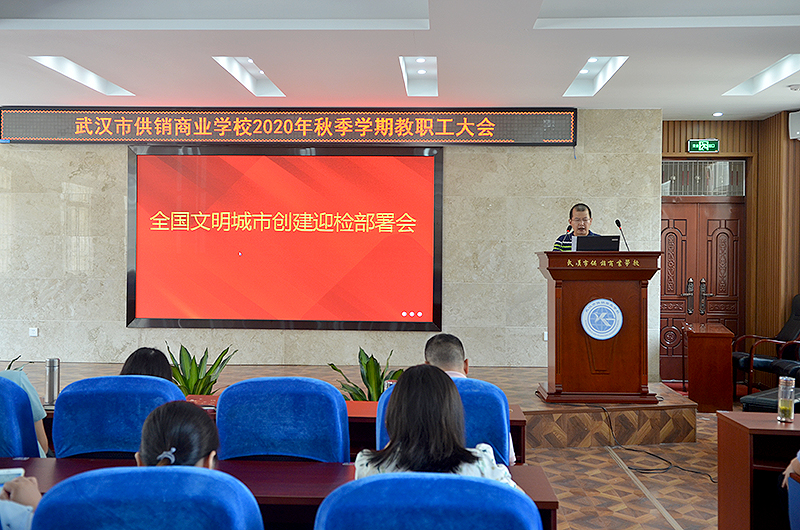 校园网消息(通讯员 施四维)2020年8月30日上午,武汉市供销商业学校在学术报告厅召开全国文明城市创建迎检工作部署会,会议由党群工作部姚喆主任主持,全体教职工参加会议。