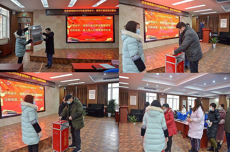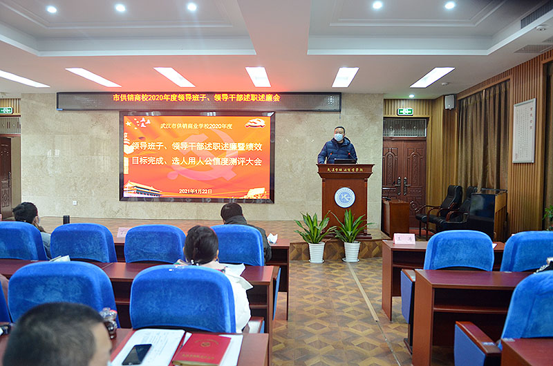校园网消息(通讯员 施四维)2021年1月22日,武汉市供销商业学校在学术报告厅设主会场,以内设机构或支部为单位设立分会场,通过斗鱼直播完成2020年度绩效考核及中层干部、支部书记述职述廉工作。