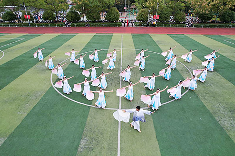 13日上午,校秋季学生田径运动会开幕式在操场上举行,本次开幕式由19营销1班户仁杰同学和19酒店1班李其瑞同学主持。首先由组委会主任王涛书记宣布了武汉市供销商业学校2021年秋季学生田径运动会开幕。19舞蹈1班同学带来一支大气磅礴富有民族特点的中国古典舞《书简》。随后我校党旗方阵、国旗方阵、校旗方阵、鲜花方阵、夙愿方阵、依次入场并进行了表演。各班运动员以嘹亮的口号、整齐的步伐进入运动场。入场式由21舞蹈1班黄谌子瑶、21计算机1班郑传昊、20美术班狄子涵同学主持。张莹珺副校长致开幕辞,在讲话中张校长对我校体育工作成绩给予了肯定,并希望运动员们团结拼搏,争创佳绩,以优异的成绩为建党100周年献礼。也希望我们的老师和同学们一起运动,在运动中展现青春力量。随后,裁判员代表张萌老师和运动员代表19舞蹈2班张燕姿同学分别进行了宣誓。最后舞蹈专业三个年级的同学给大家精彩绝伦的拉丁舞表演和热情洋溢的啦啦操表演。