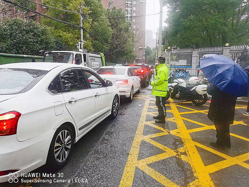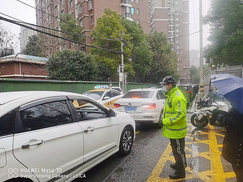 2022年2月17日上午8点至11点正是学生返校的高峰时段,洪山区交通大队南湖中队部署专门警力,提前到学校门口及周边路口、路段,清理学校周边违停车辆;针对返校高峰期带来的交通拥堵,对过往车辆进行管控、分流,指挥校门口接送学生的车辆安全通行,有序停放,确保学生安全进校园。