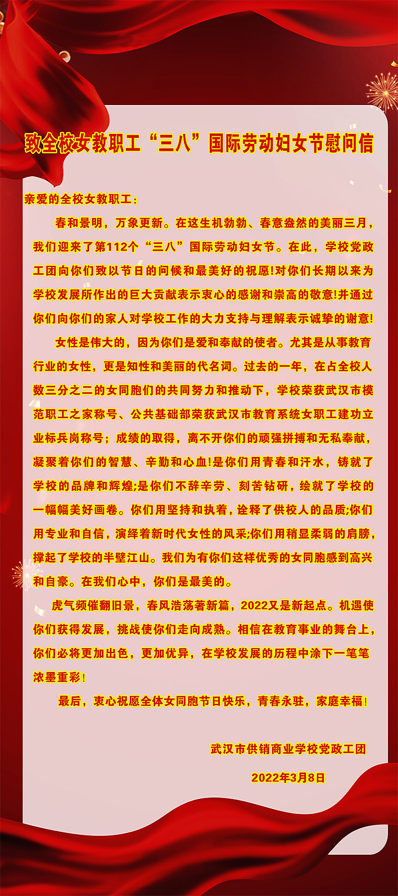 3月8日,武汉市供销商业学校全体女教职工坚守工作岗位,她们以实际行动争做伟大事业的建设者、敢于追梦的奋斗者,尽展巾帼风采;沈敏校长高度赞扬了她们敬业奉献、拼搏进取的精神,向全体女同胞致以节日的祝贺和美好的祝愿。