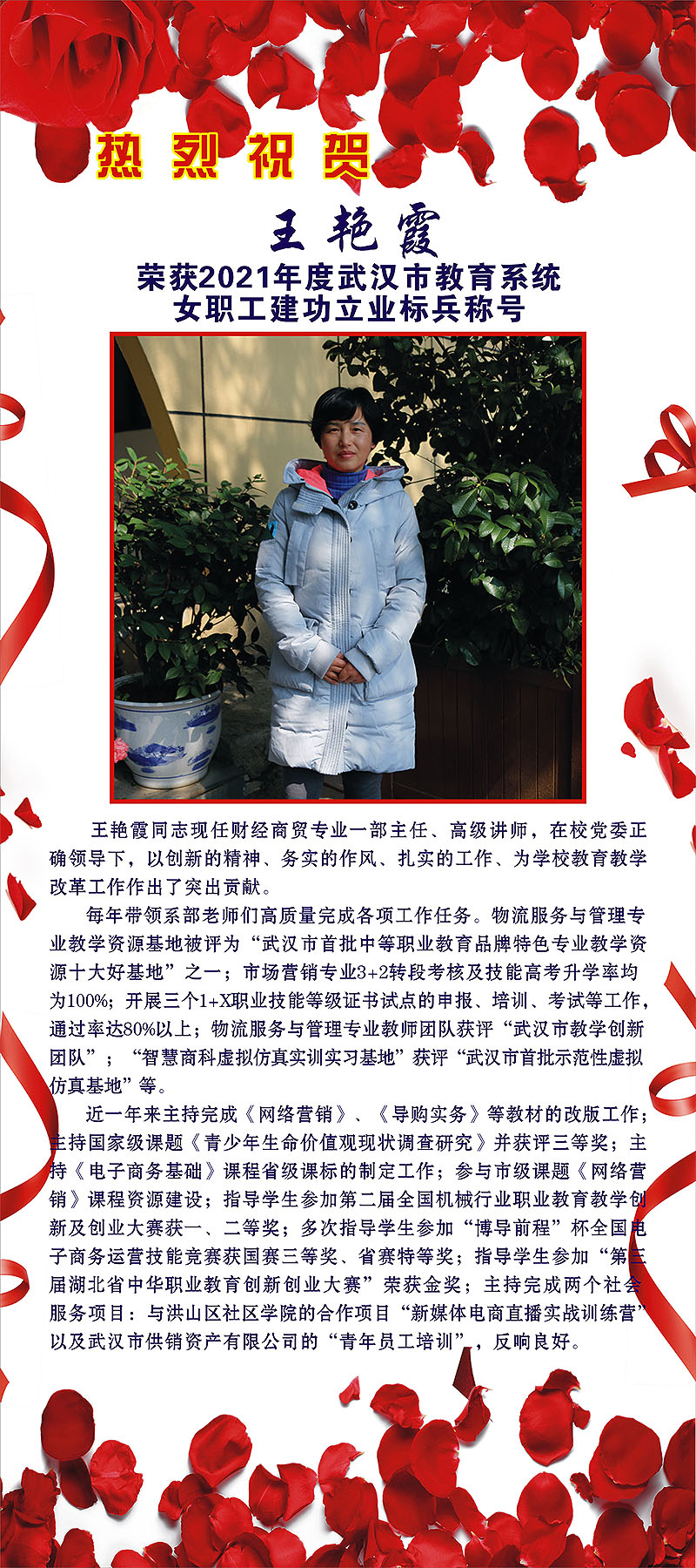 热烈祝贺王艳霞荣获2021年度武汉市教育系统女职工建功立业标兵称号!