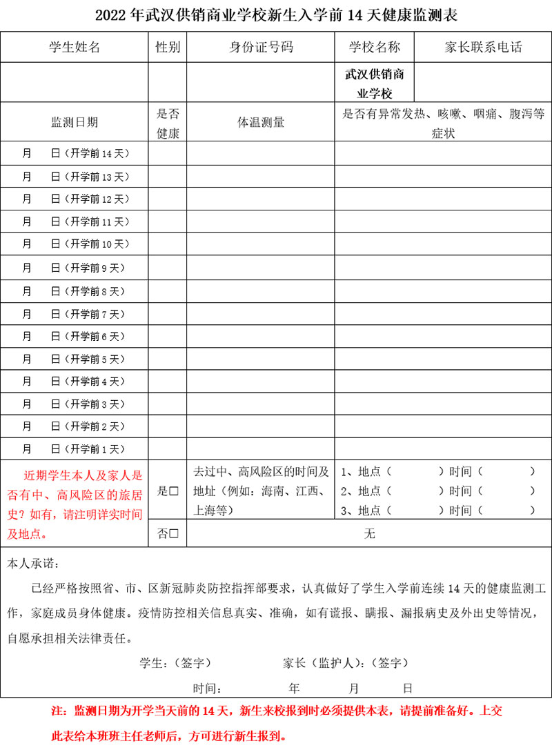 附: 2022年武汉供销商业学校新生入学前14天健康监测表