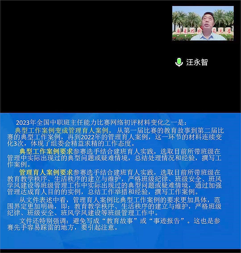 (通讯员 熊莉)为加强中职班主任队伍建设,进一步推进和完善学校德育工作,武汉市供销商业学校于2023年3月8日举行了《德育典型案例撰写与思考》专题线上讲座,中国职教学会德育工作委员会副主任、广东省中等职业学校德育研究与指导中心主任、广东省中等职业学校德育研究会会长汪永智教授主讲。